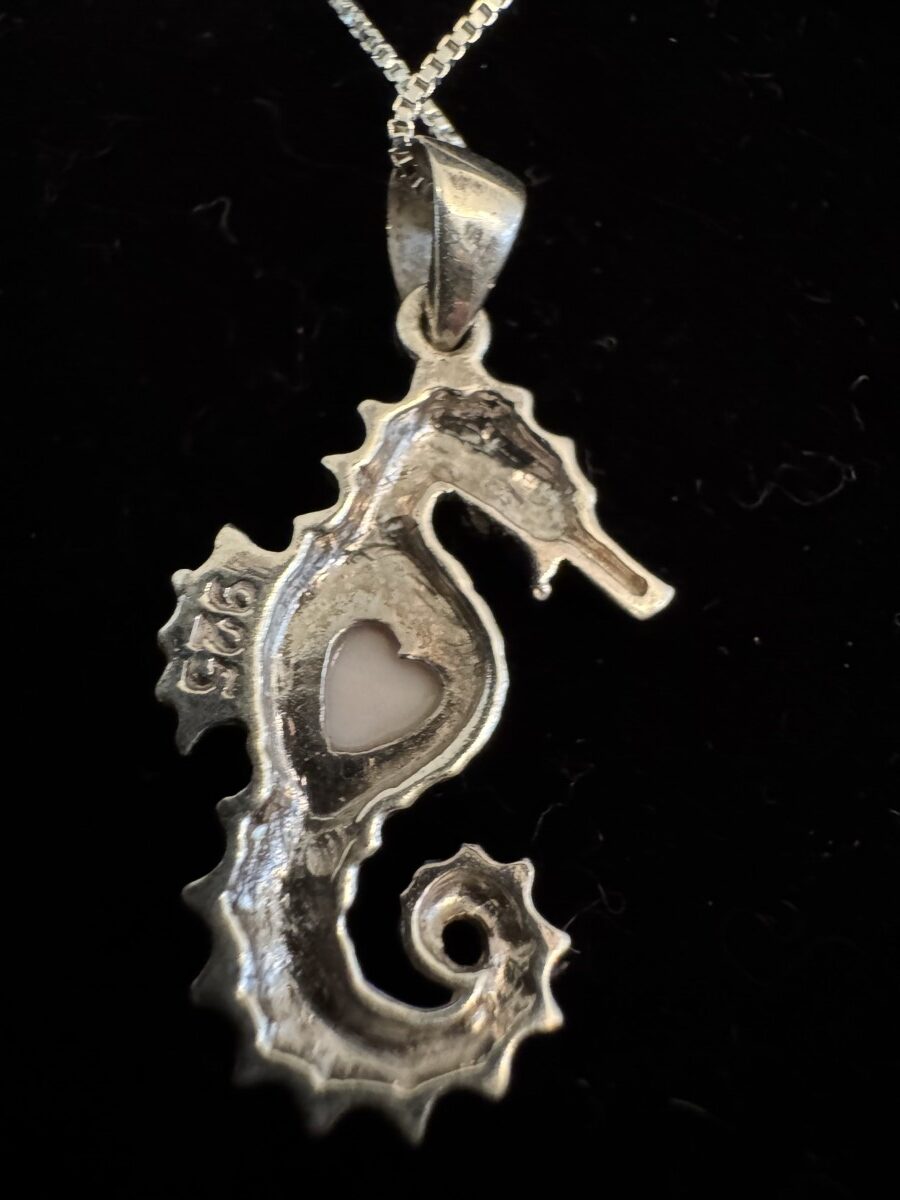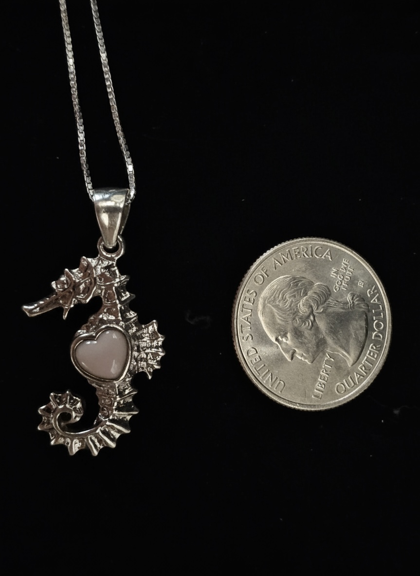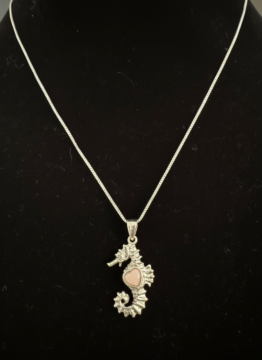 This is an adorable, dainty sterling silver seahorse with a heart shaped pink opal. 18 inch chain included
