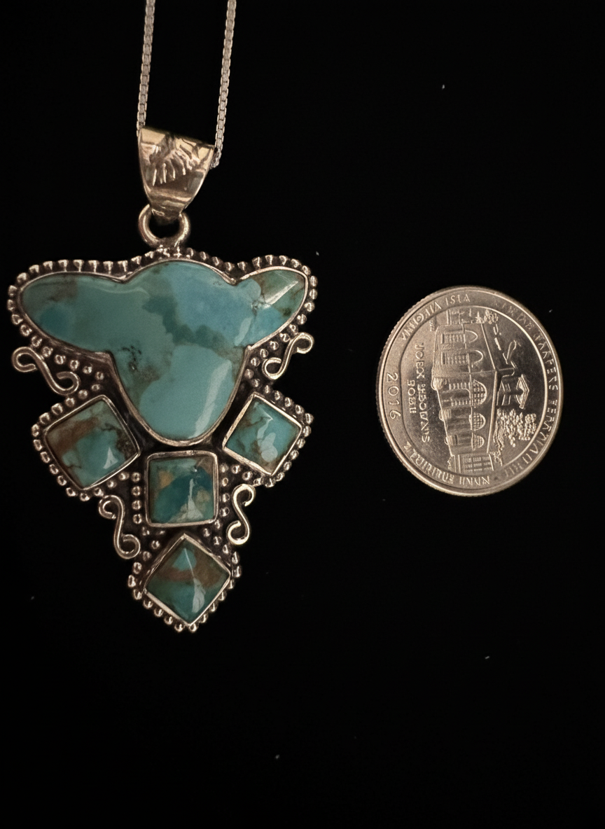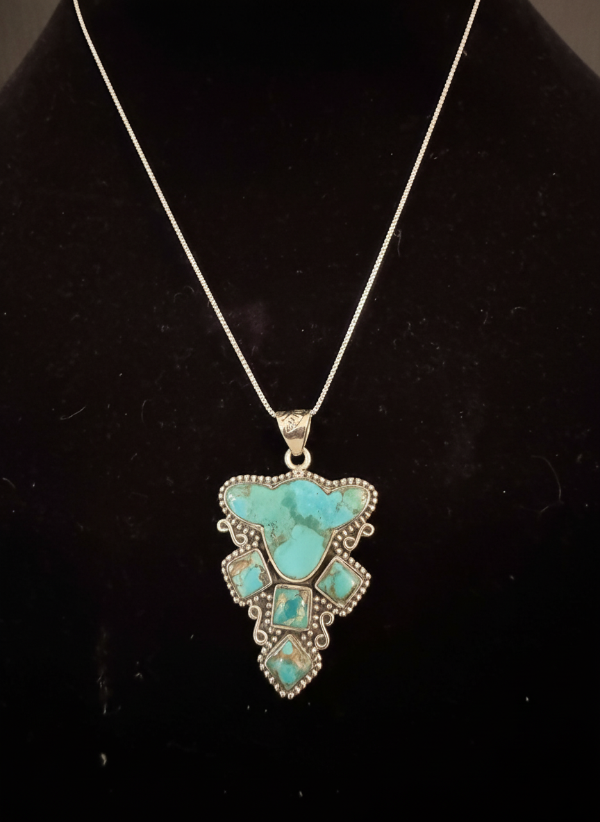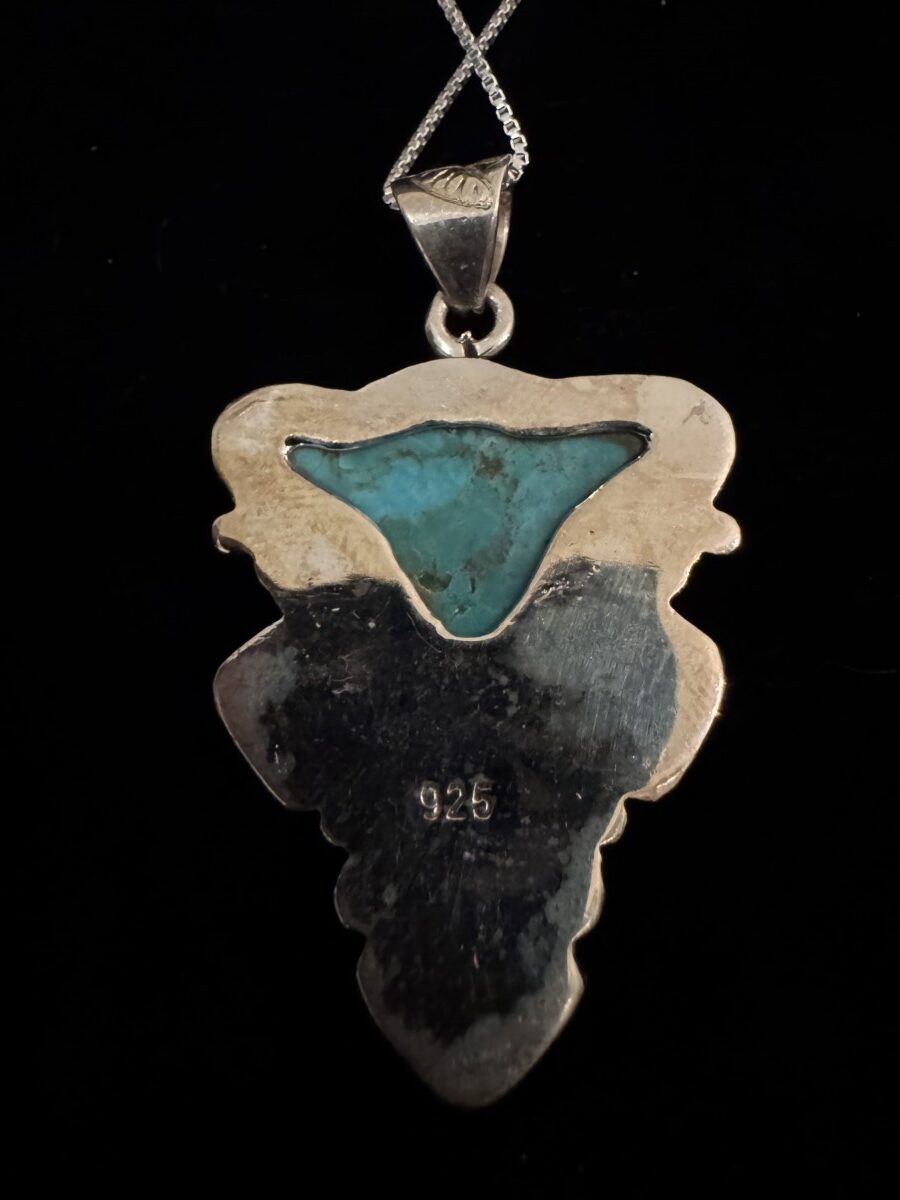 This is such a great piece. It has a kingman Turquoise cow head with small pieces of turquoise Accents. Set in stunning sterling silver 18 inch chain included