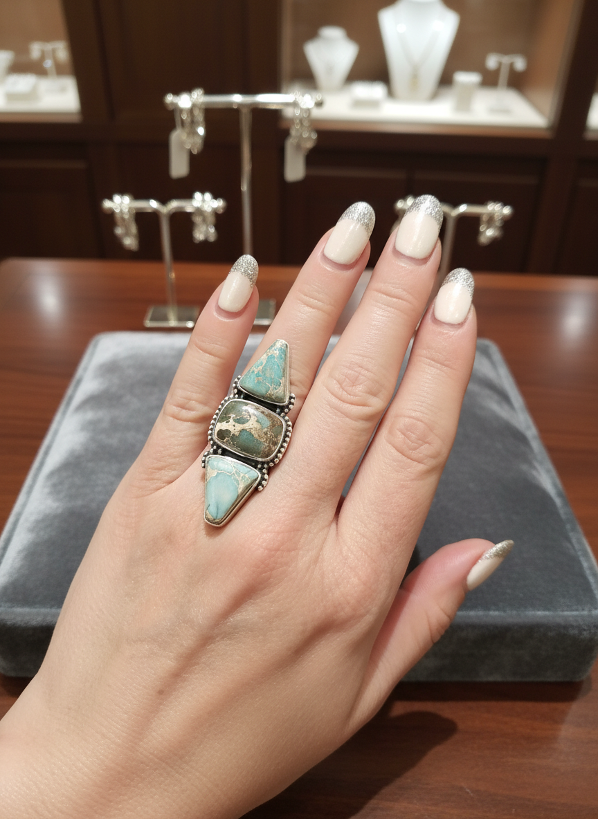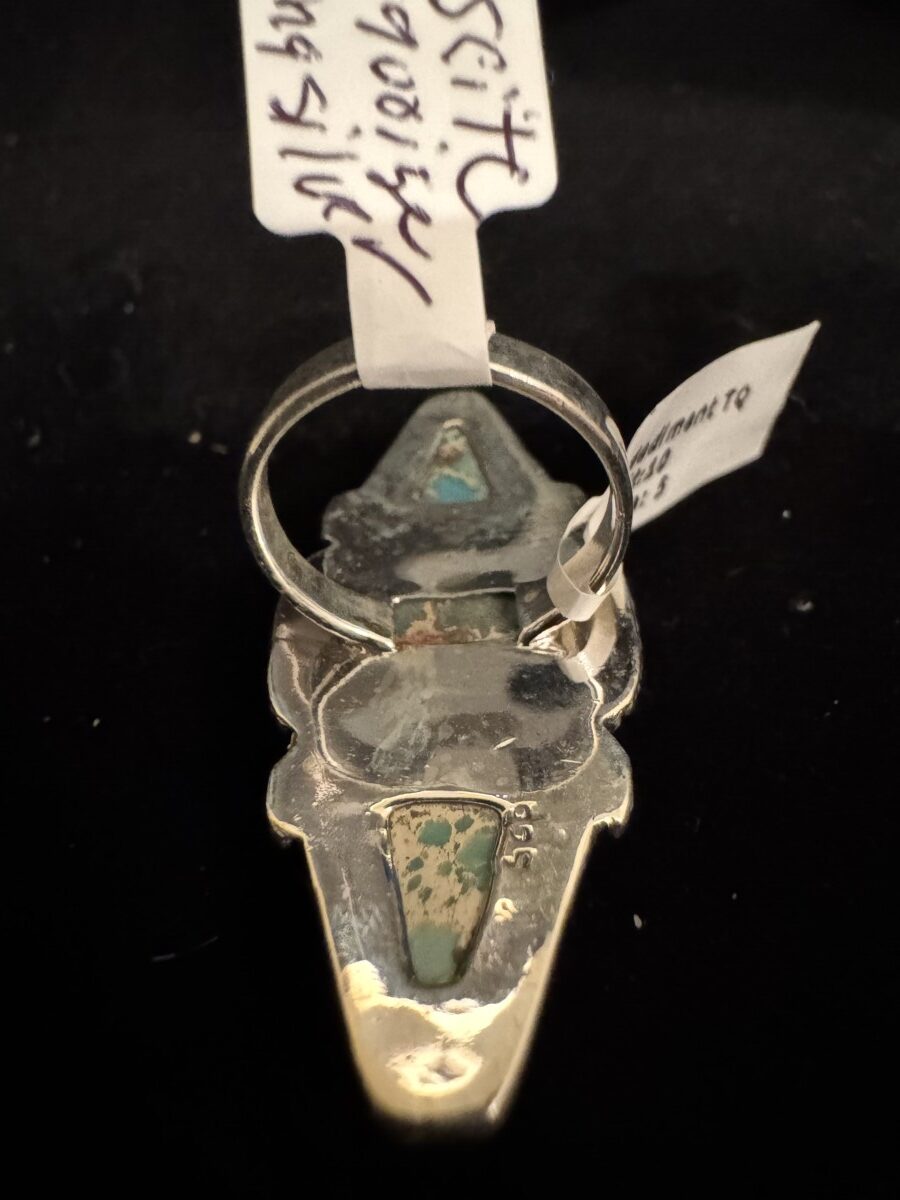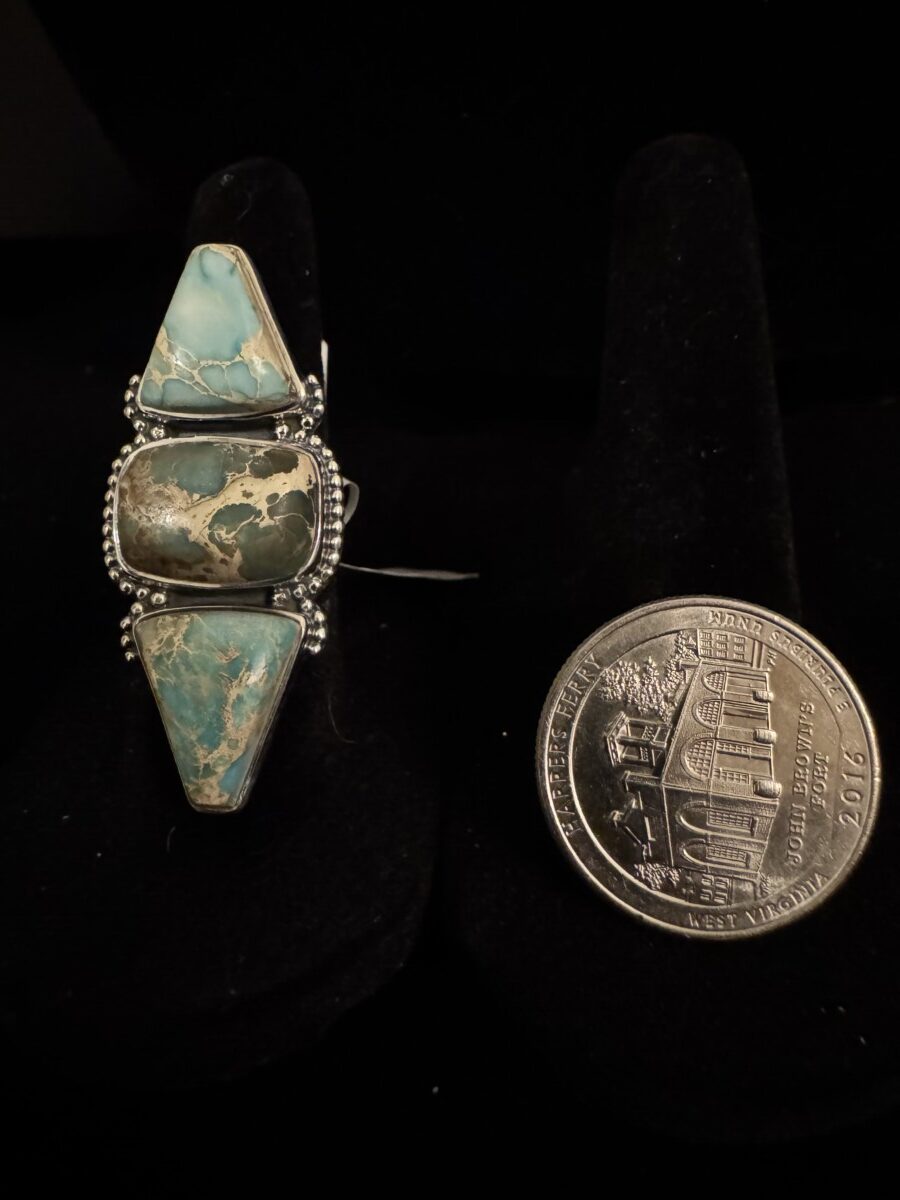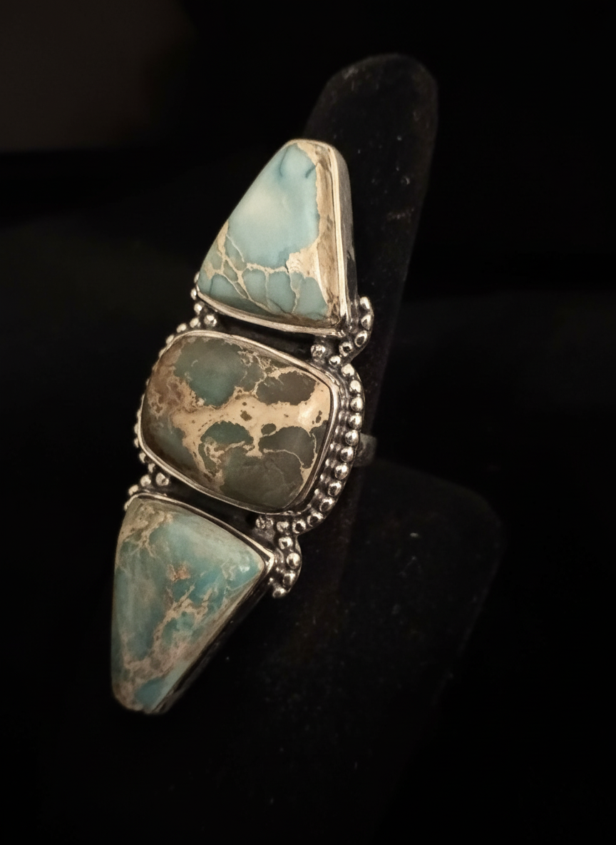 This ring is beautiful featuring two triangular pieces of turquoise and a rectangular center stone. Set in a detailed sterling silver setting. Currently size 5, but could be sized by a jeweler.