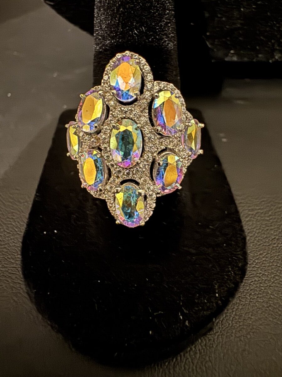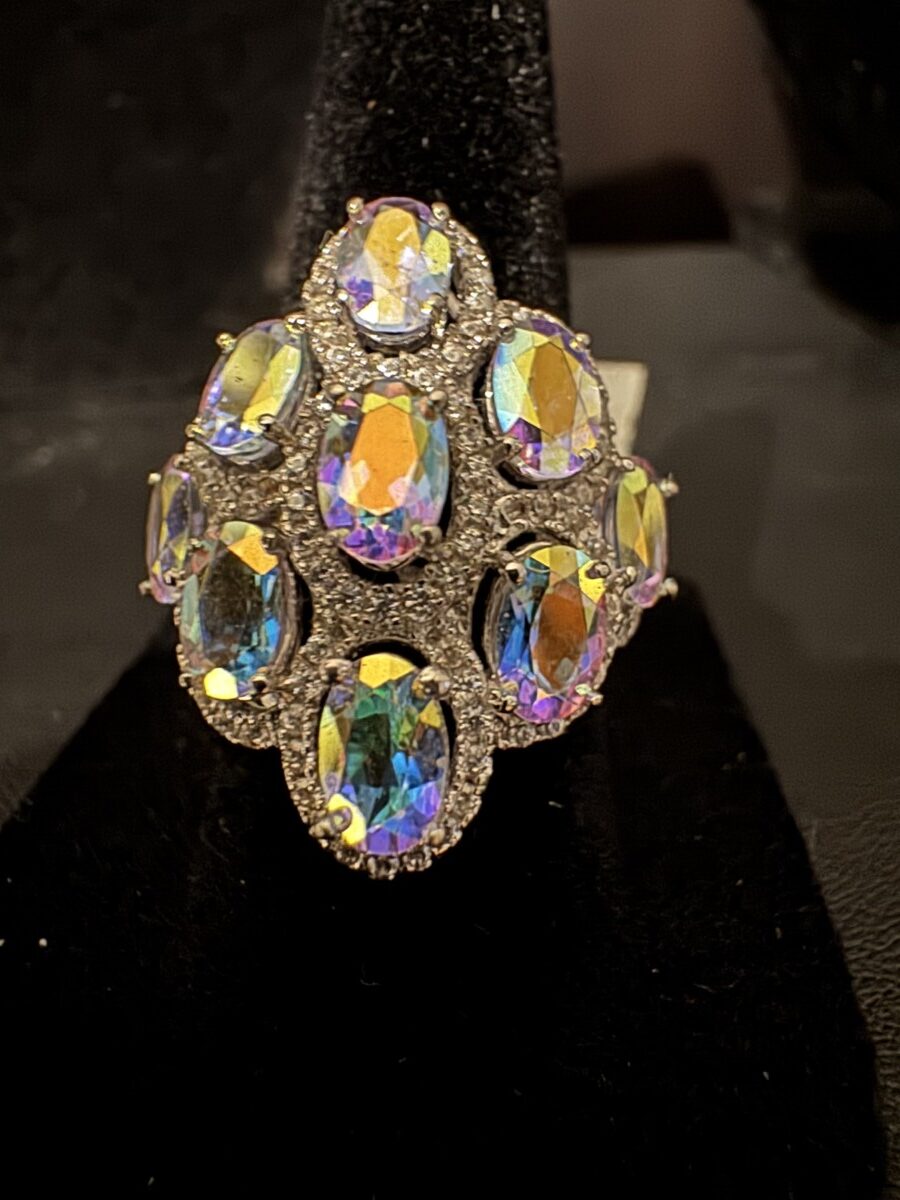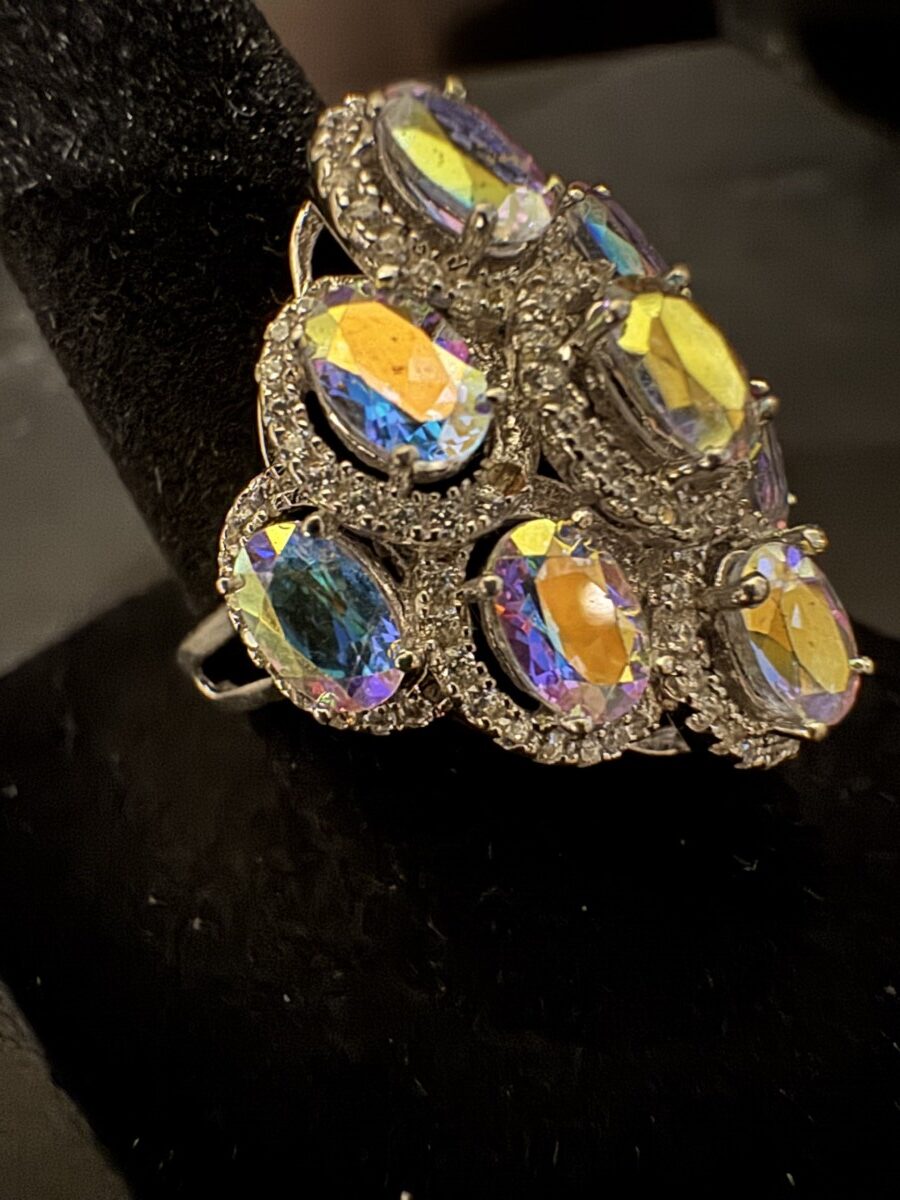 This is a beautiful blue obsidian stone ring set in an intricate sterling silver setting. Size 7, and can be sized by a jeweler