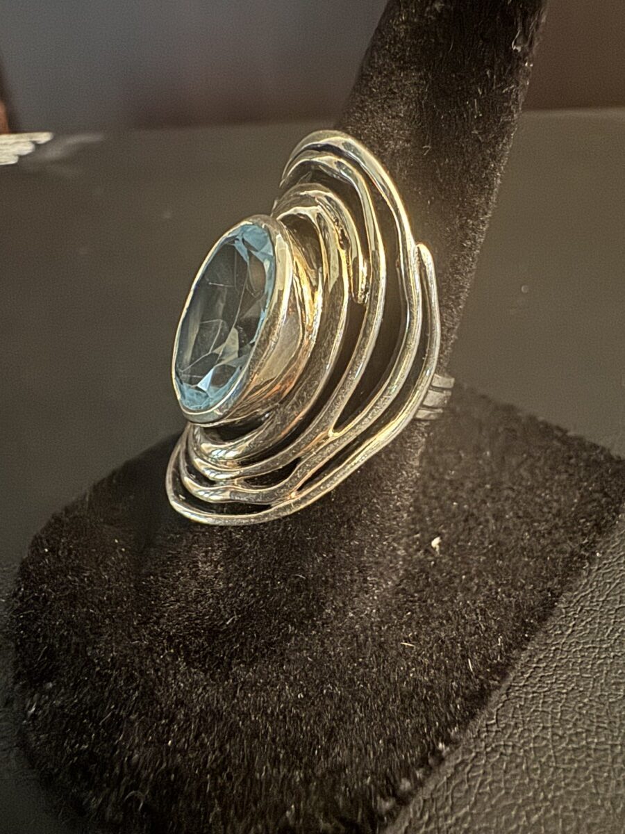 This is a beautiful oval cut blue topaz set in a modern classy sterling silver setting. The ring is currently a size 6 that can be sized up or down by a jeweler. You will love this. It’s gorgeous!