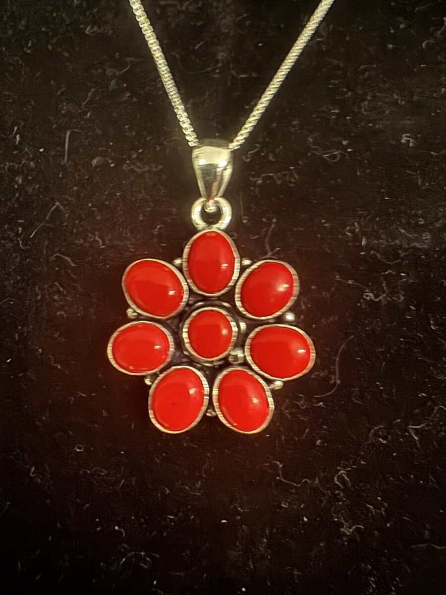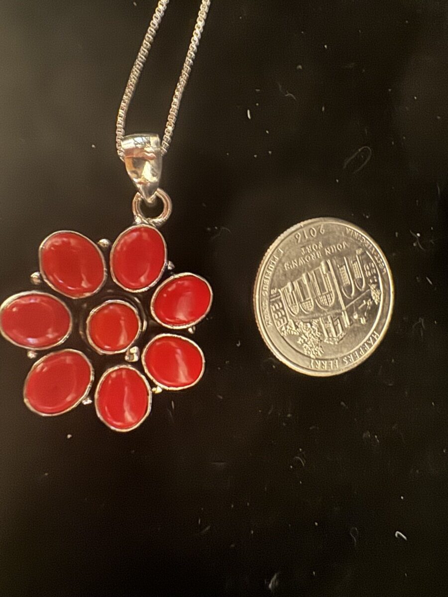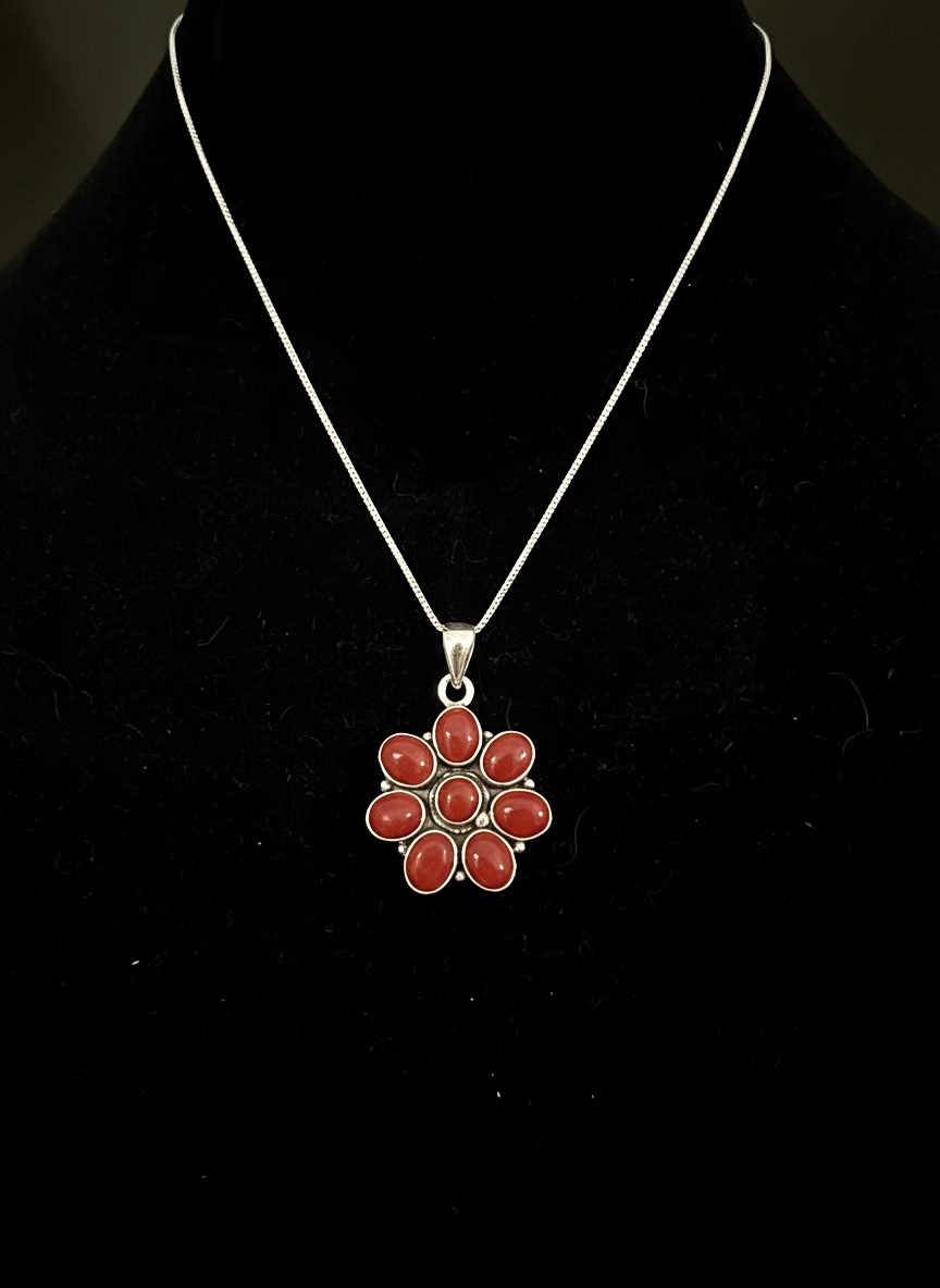 Beautiful flower shaped pieces of coral set in sterling silver with an 18 inch chain.