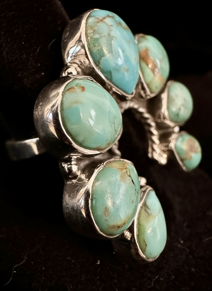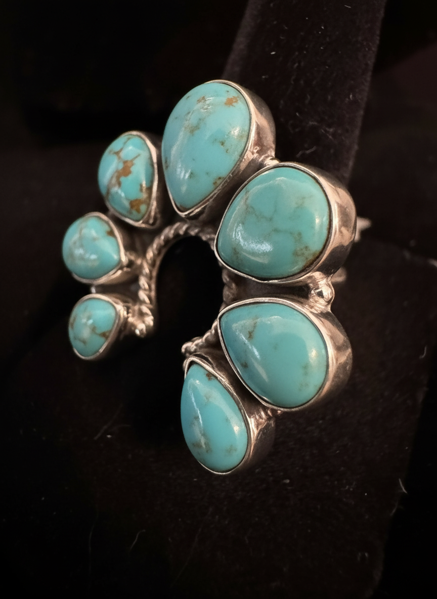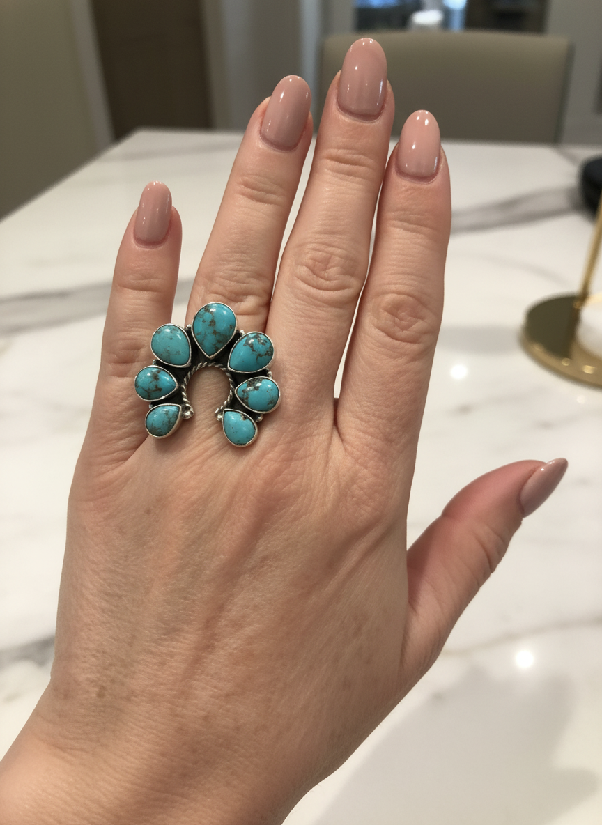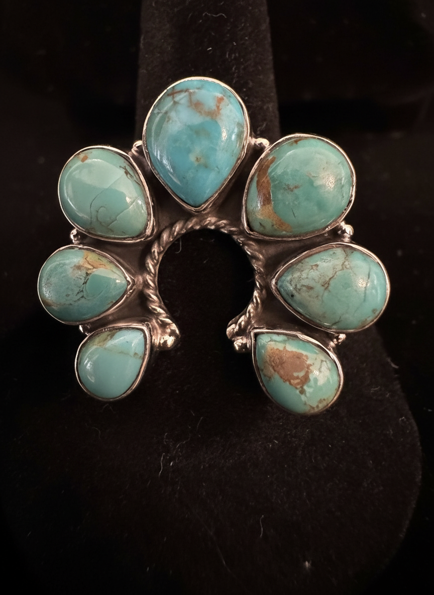 This is a beautiful, genuine sterling silver and genuine, turquoise naja Style native style ring. Closed back. Adjustable size