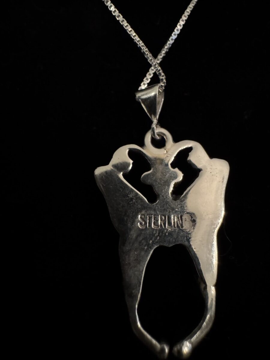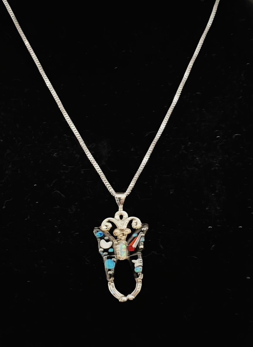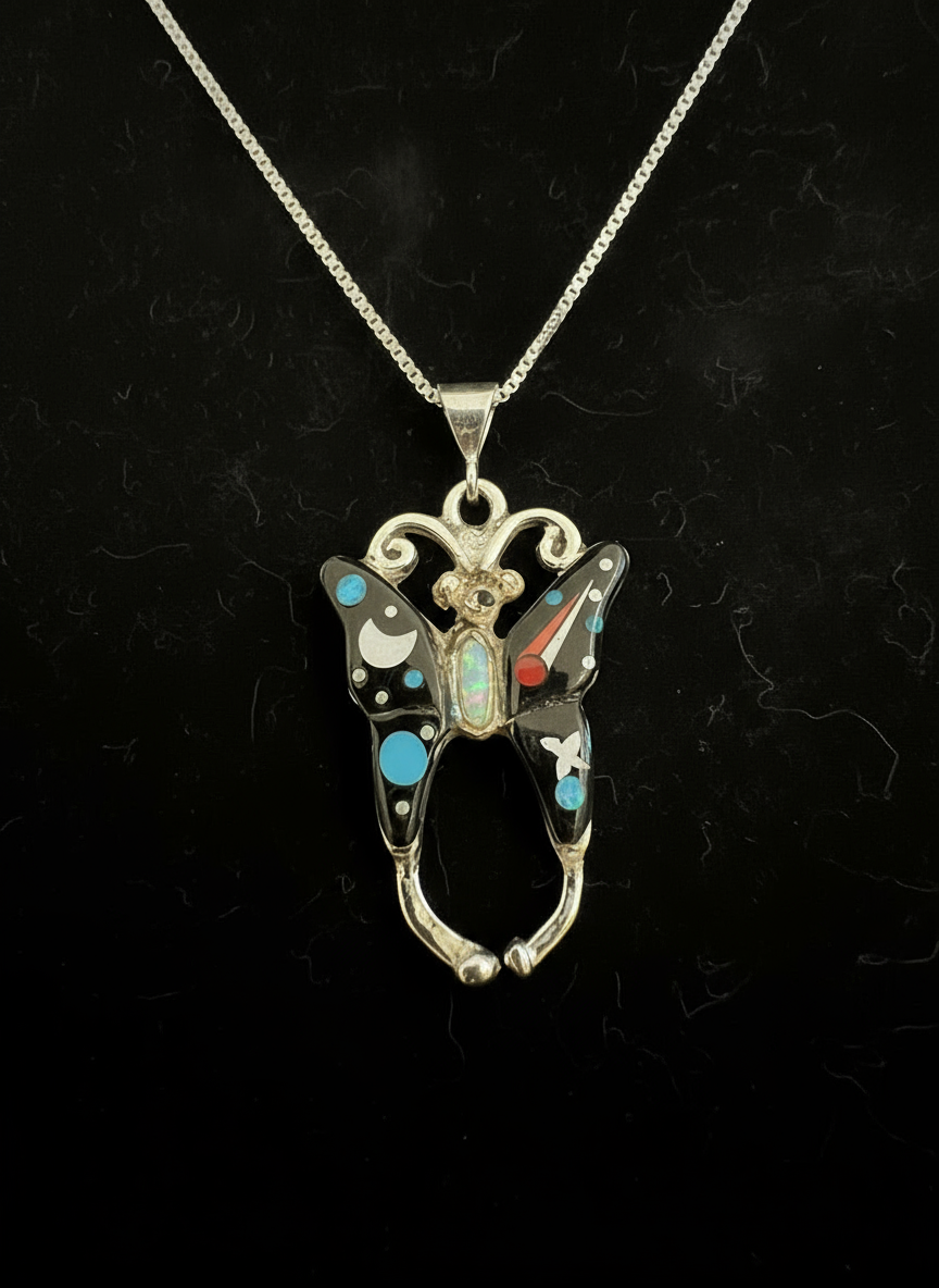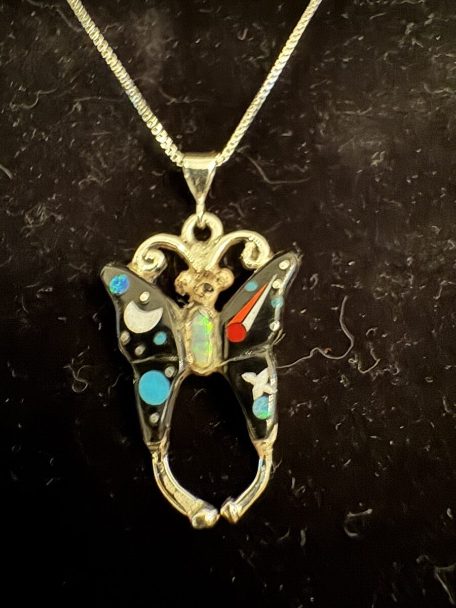 This is a beautiful inlaid handmade pendant in the shape of a butterfly. Set in a beautiful sterling silver setting complete with chain. Dainty and beautiful