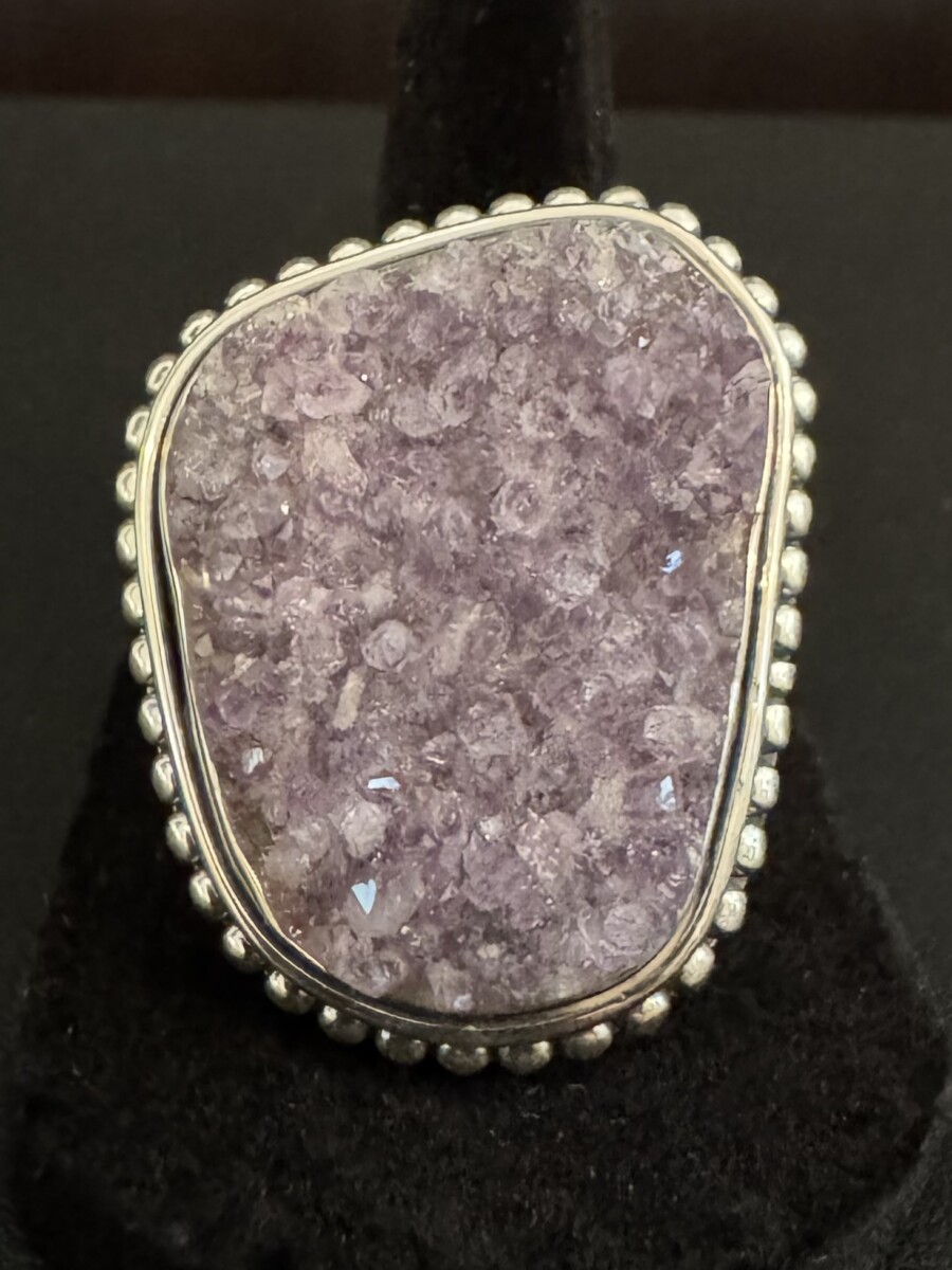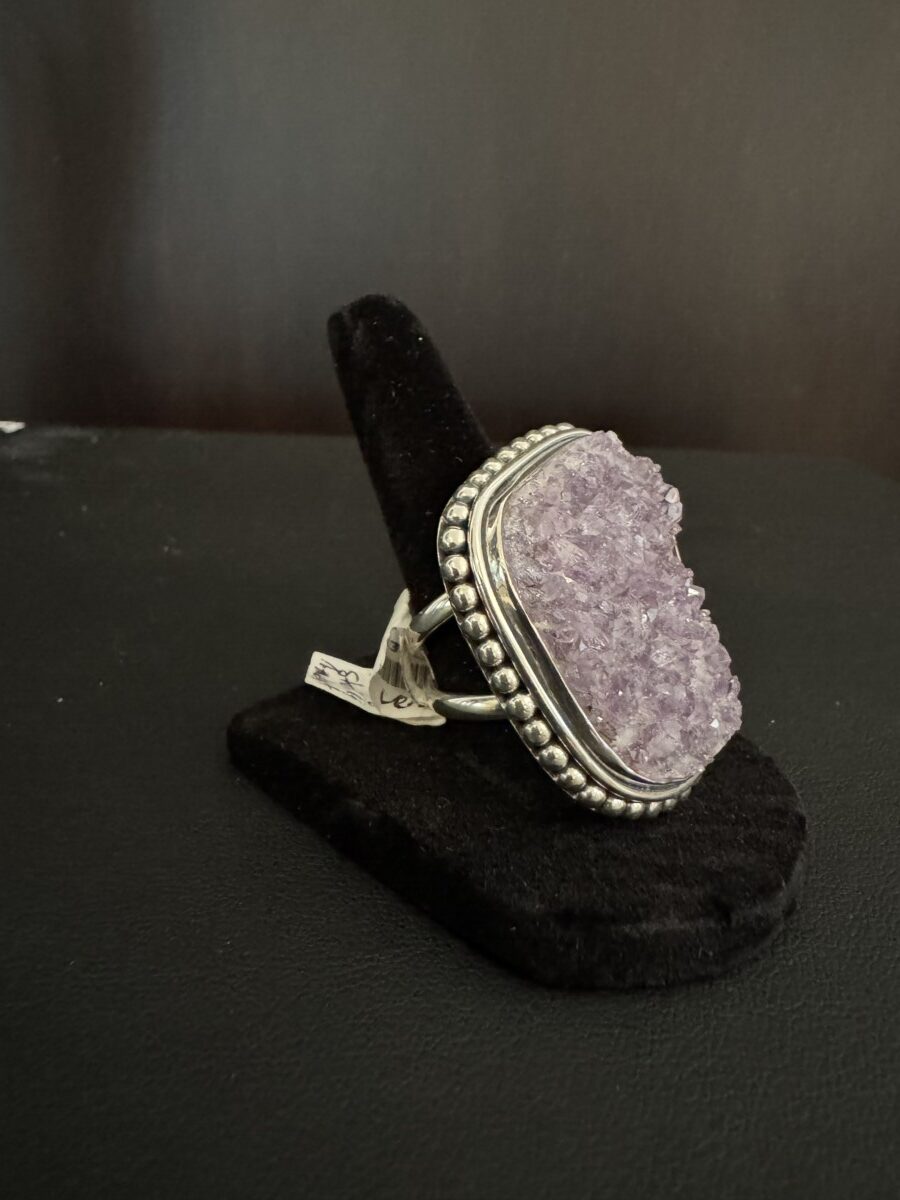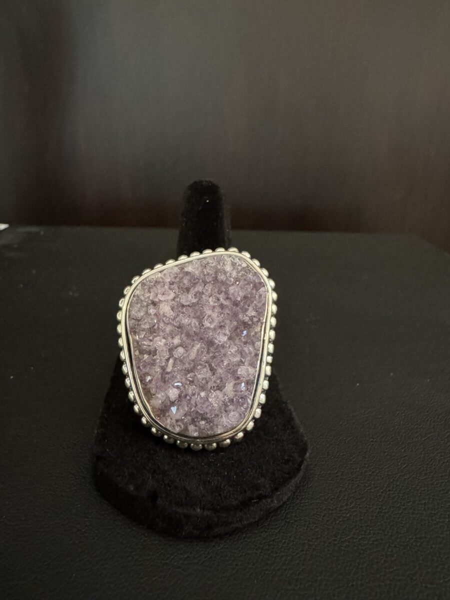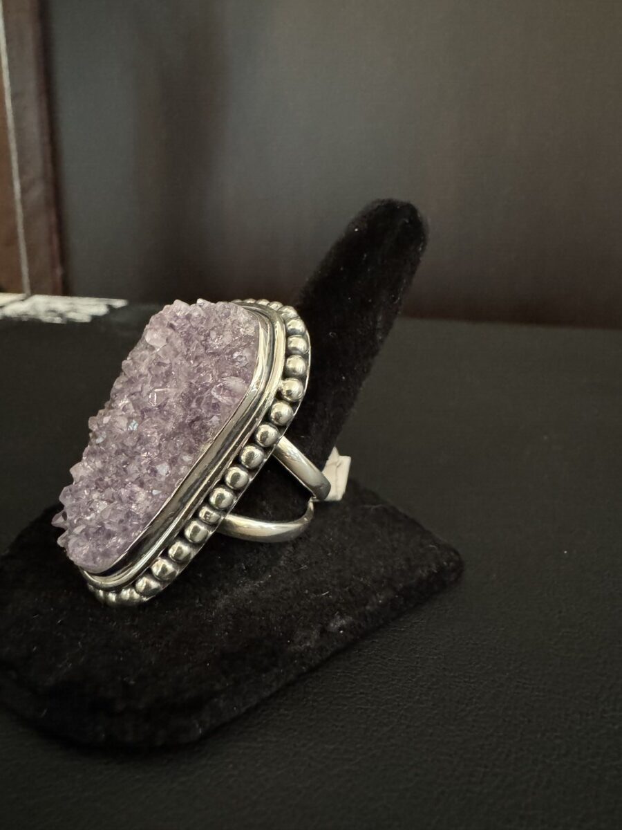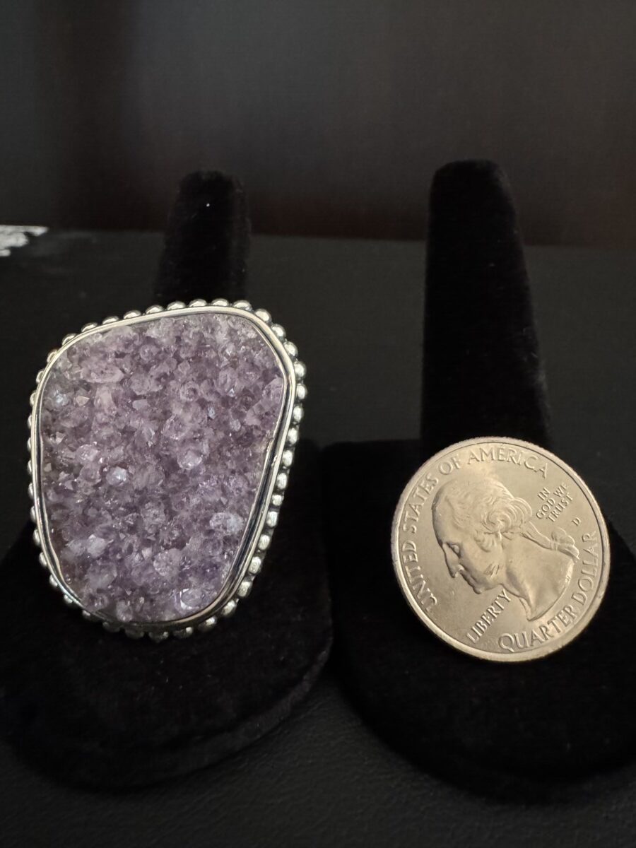 Very large amethyst set in a stunning sterling silver setting. This is definitely a statement ring that will attract compliments! Simply stunning! Size 7.5