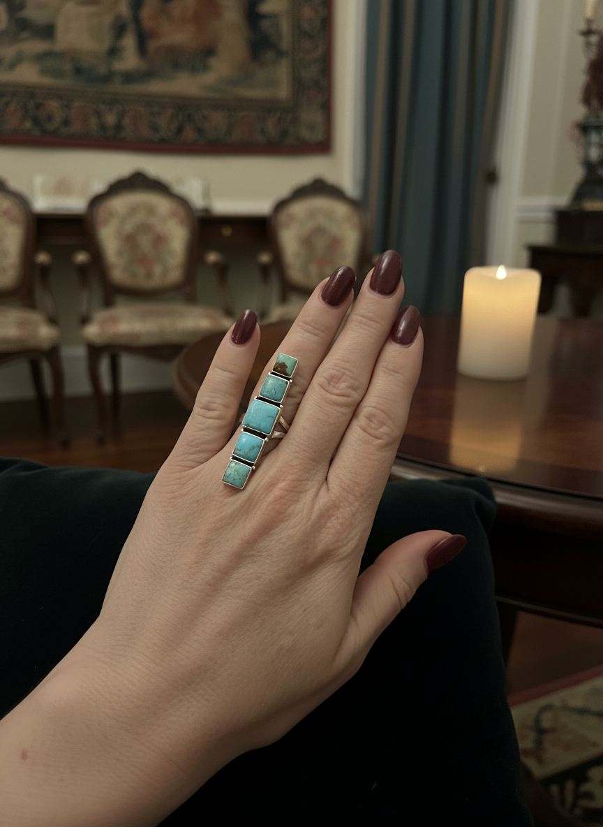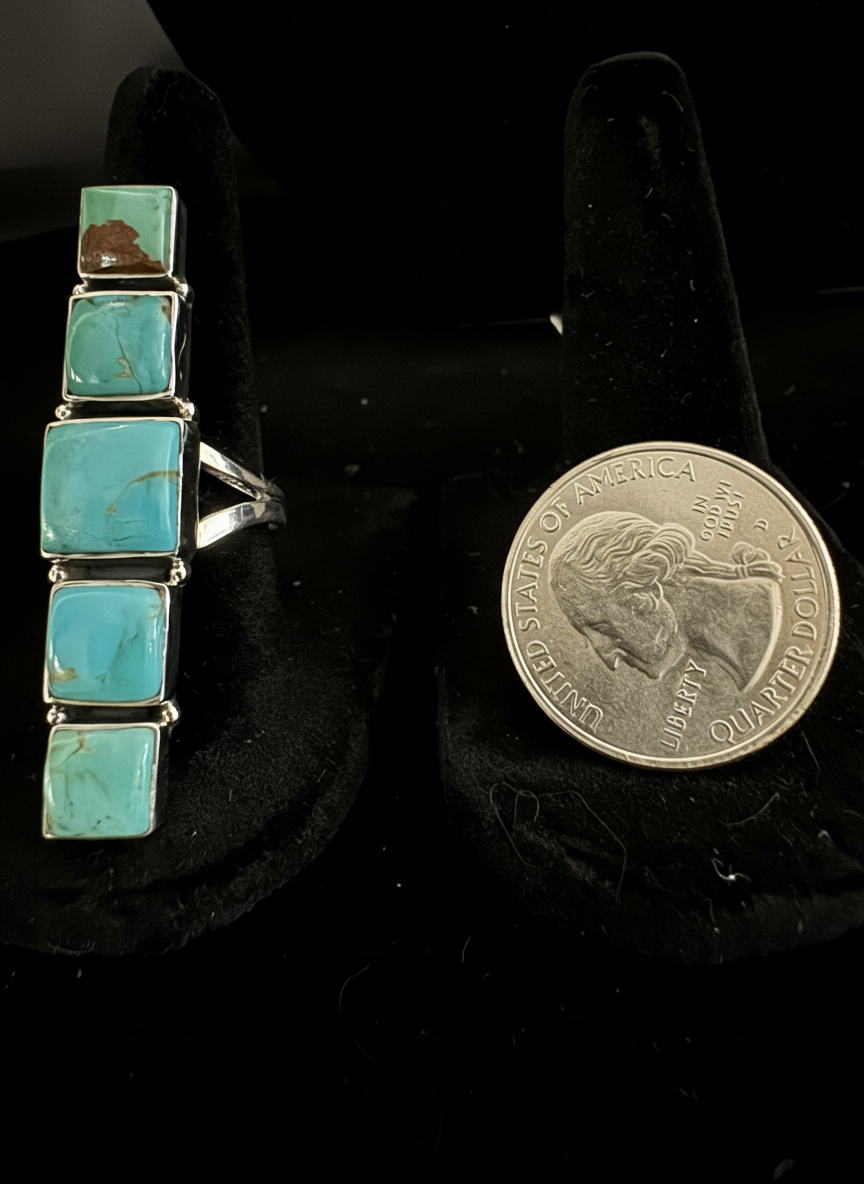 Beautiful five stone genuine turquoise ring set in a stunning sterling silver setting. This ring is unusual and is a large statement piece. You will love it! Adjustable size. Closed back