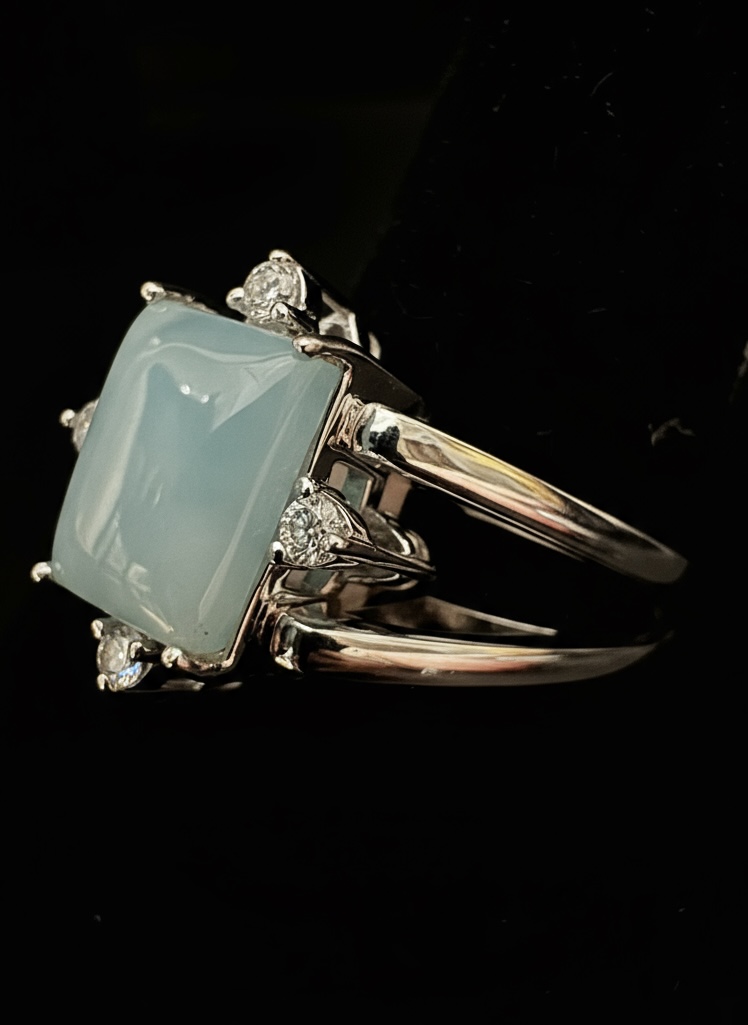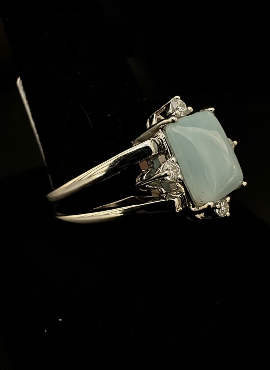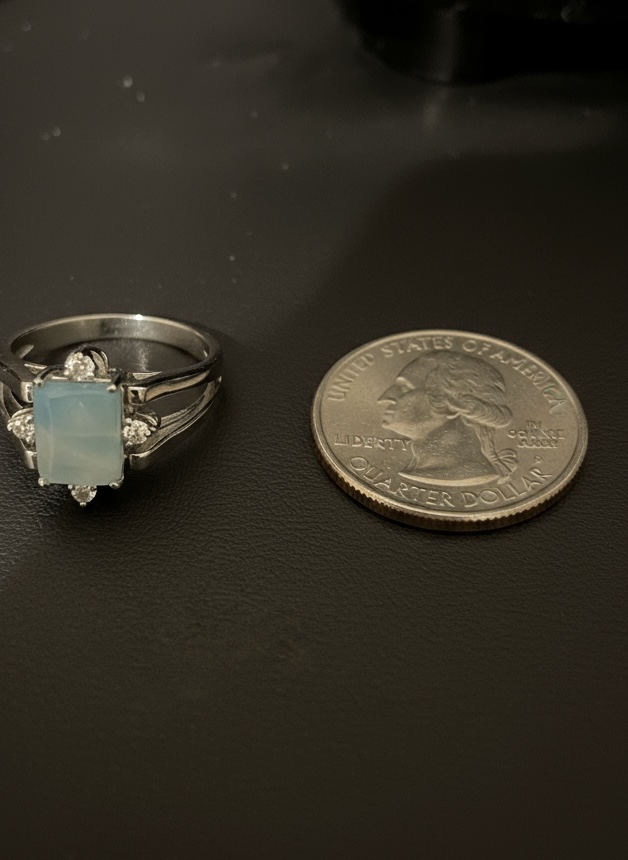 This is a very elegant and classy, yet dainty genuine Larimar set in a sleek sterling silver setting.  Luxurious elegance!  Size 8 1/2 that can be sized by a jeweler