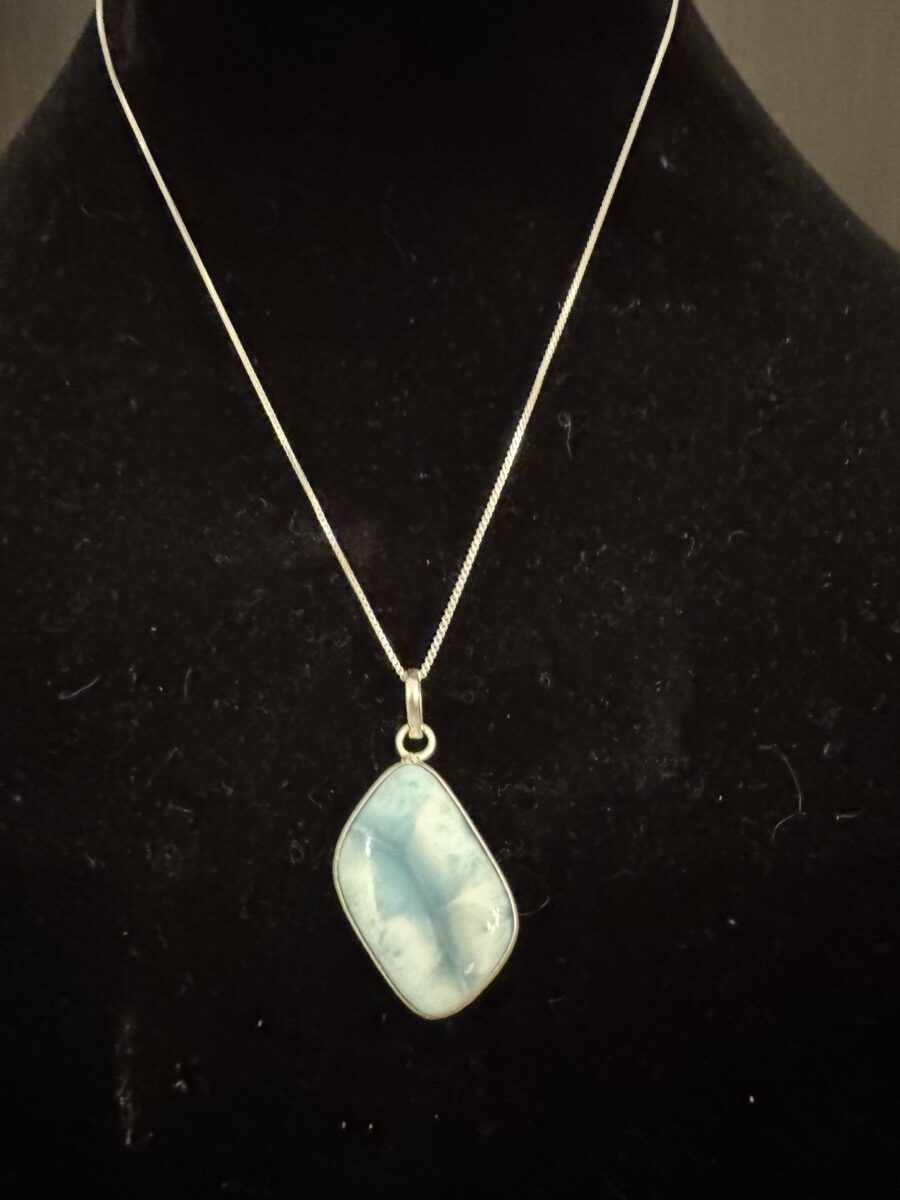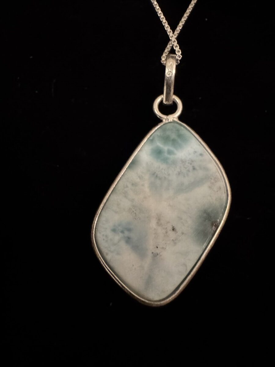 Beautiful freeform Larimar pendant. Set an elegant sterling silver setting 18 inchchain is included. Larimar It’s a very rare stone and so beautiful