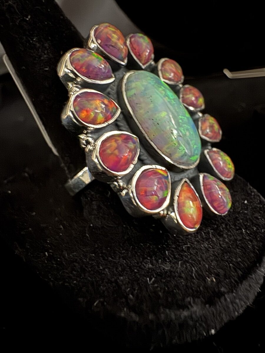 Beautiful opal and red opal ring set in a stunning sterling silver setting