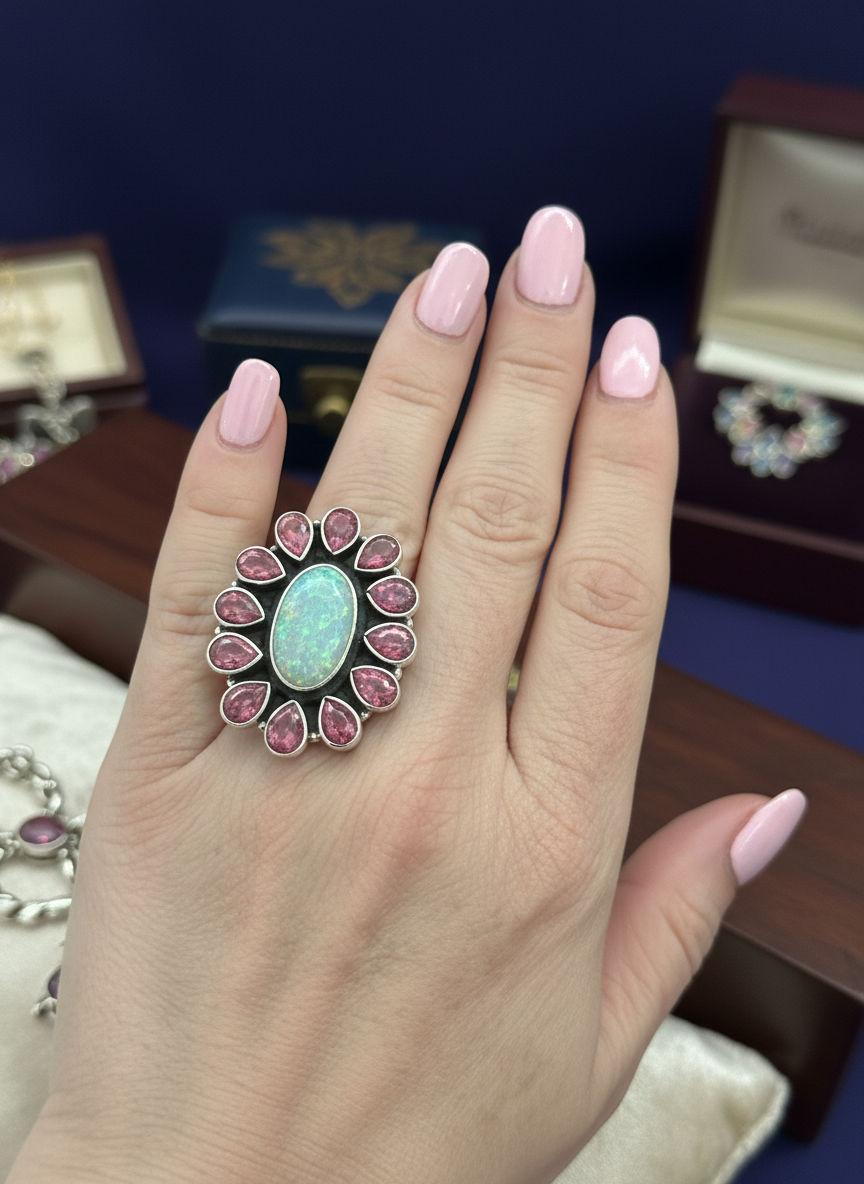 This is a beautiful ring, genuine, opal, and Genuine red opal set in a stunning sterling silver setting.  This ring is certainly a beauty, and you will get many compliments on it from your friends