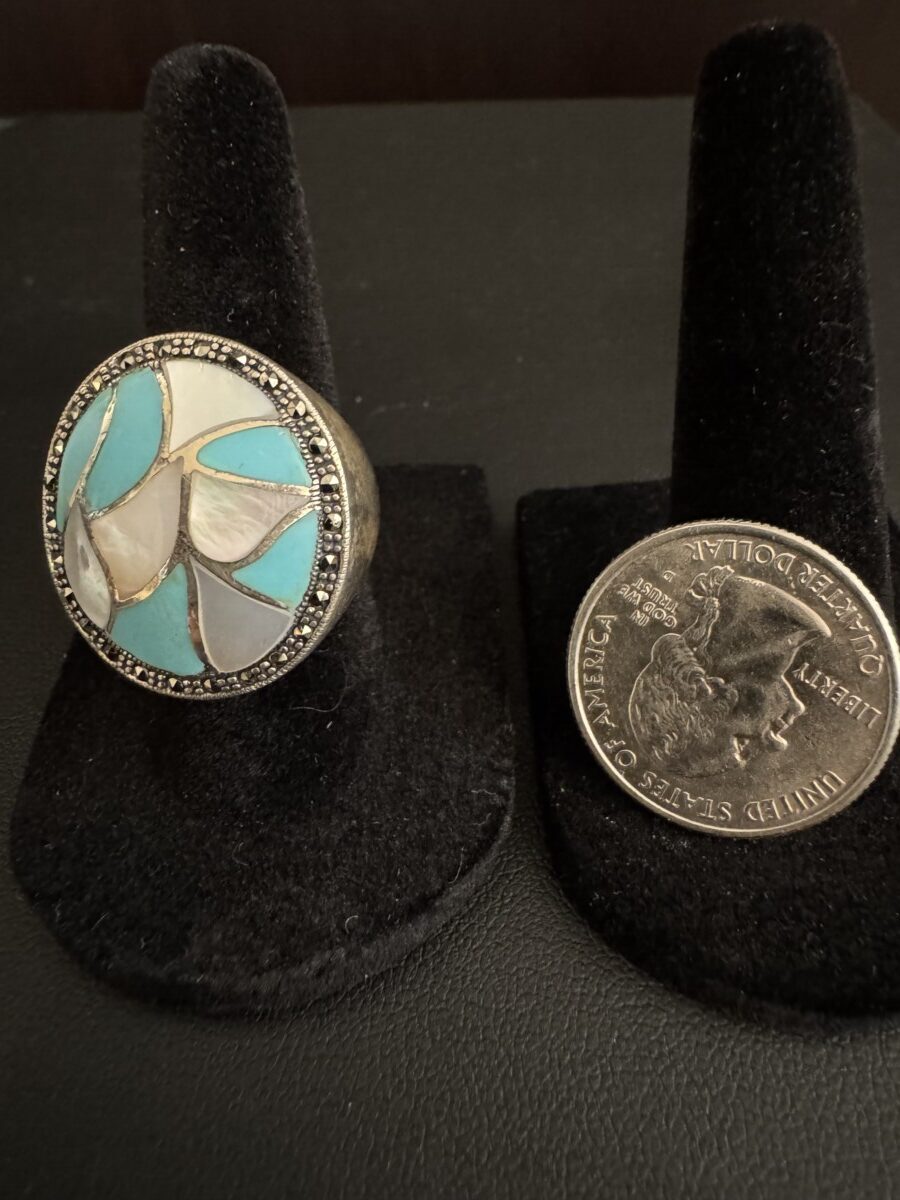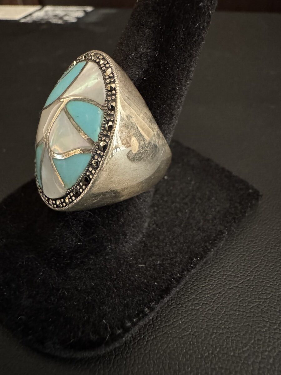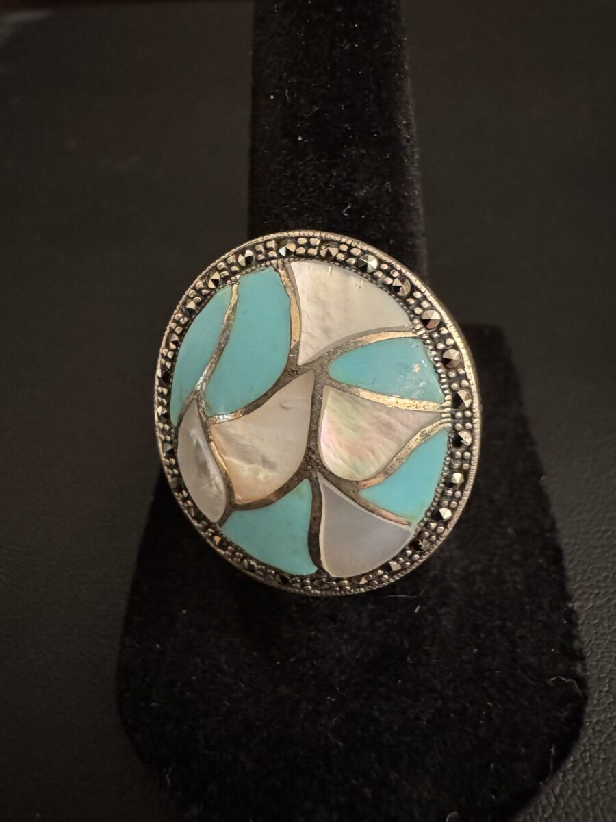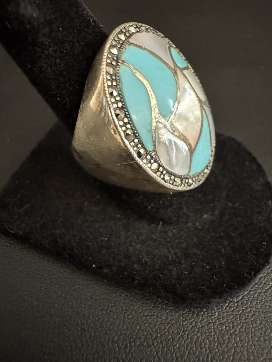 This is a beautiful, genuine, turquoise and mother of pearl oval ring set in a stunning sterling silver setting!