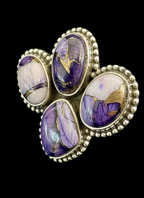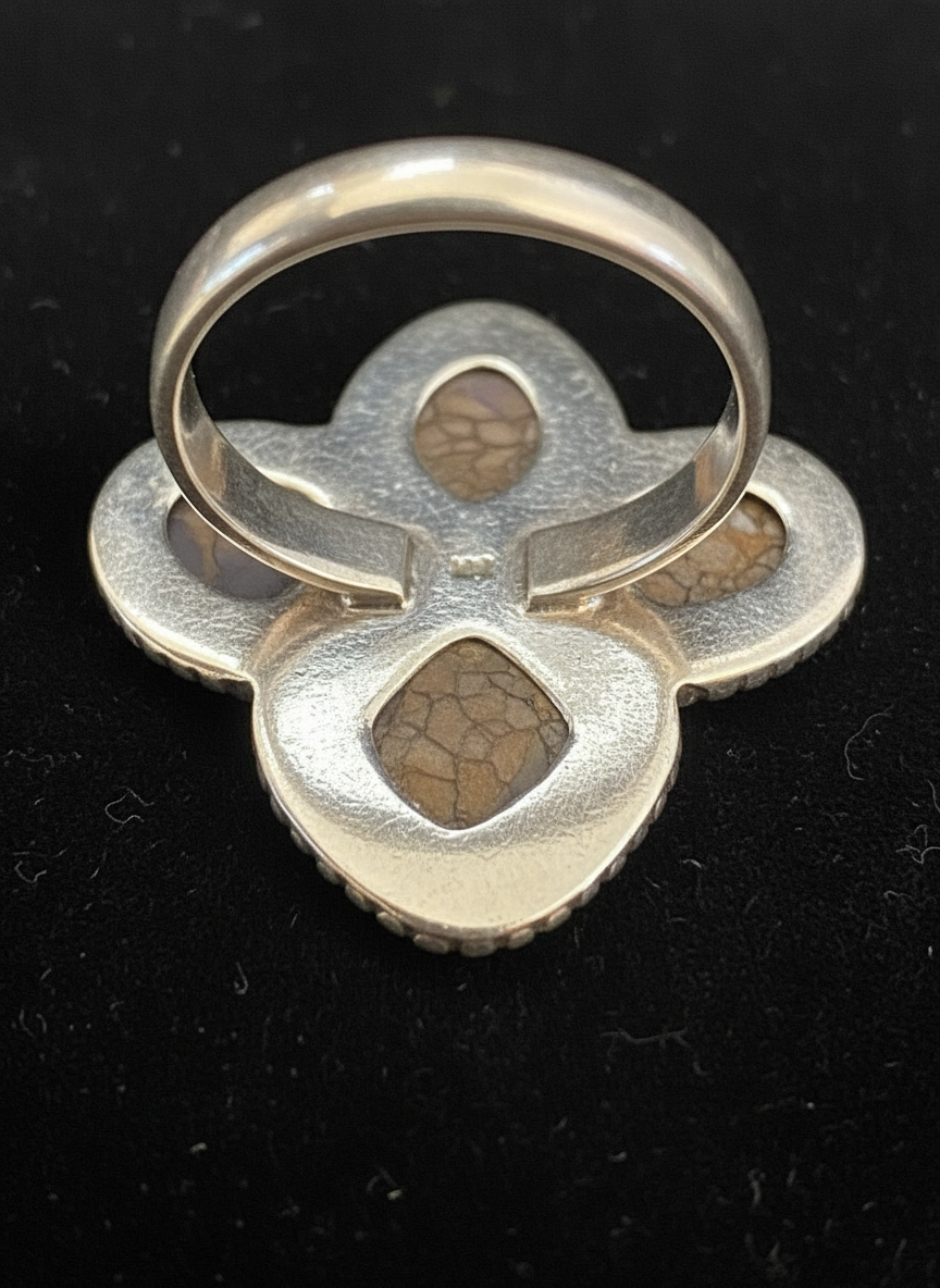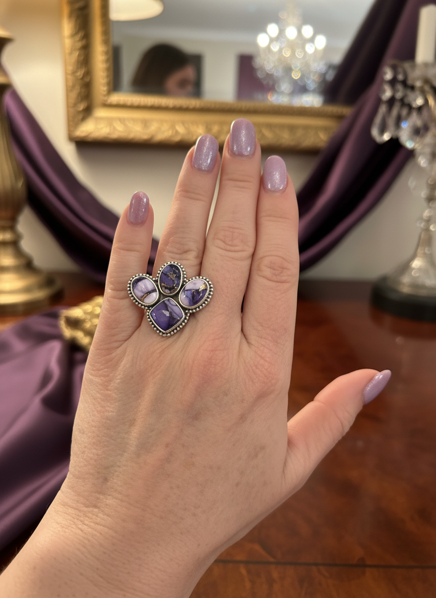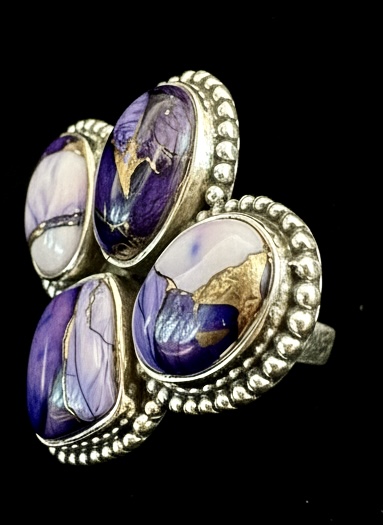 This is a beautiful, four scone ring, purple and white turquoise set in a stunning sterling silver setting. Intricate workmanship make this a winner. Size 9, and can be sized by a jeweler