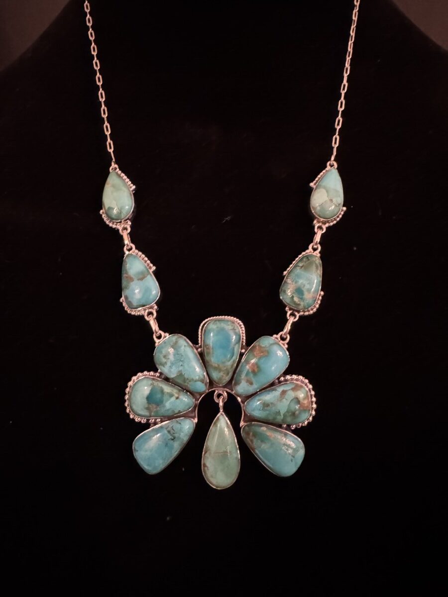 Beautiful statement, turquoise, and sterling silver squash, blossom necklace