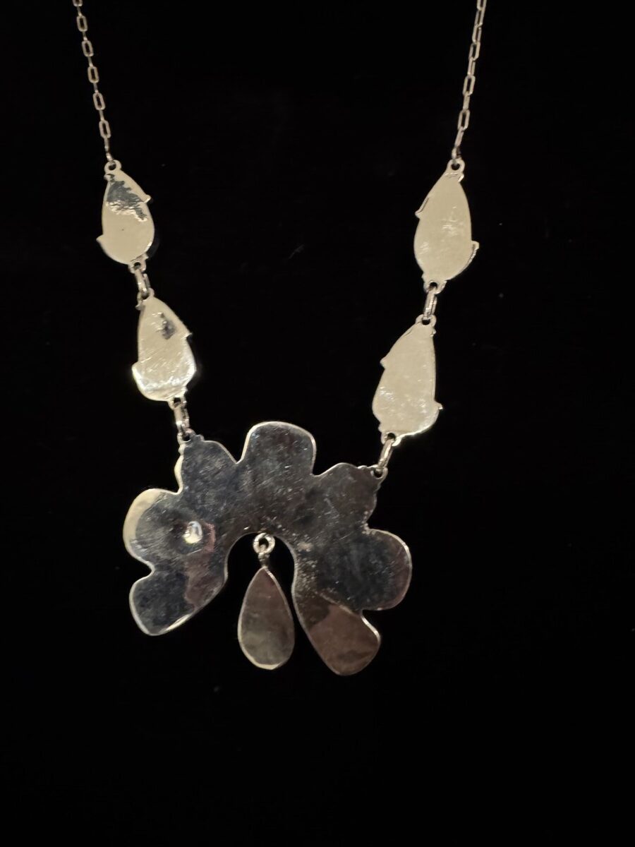Large and studying turquoise and sterling silver squash blossom necklace. Closed back well-made. You will love this