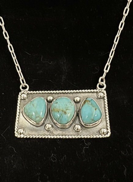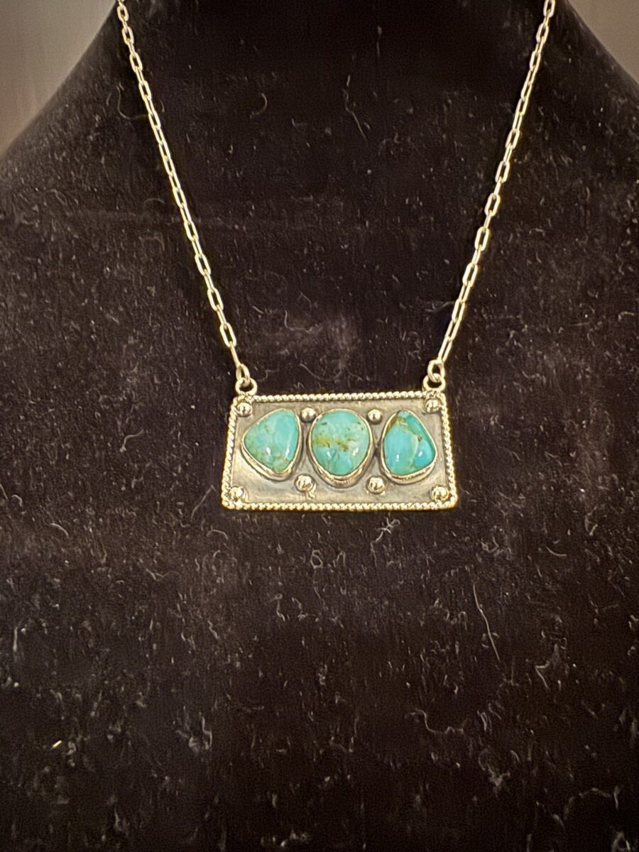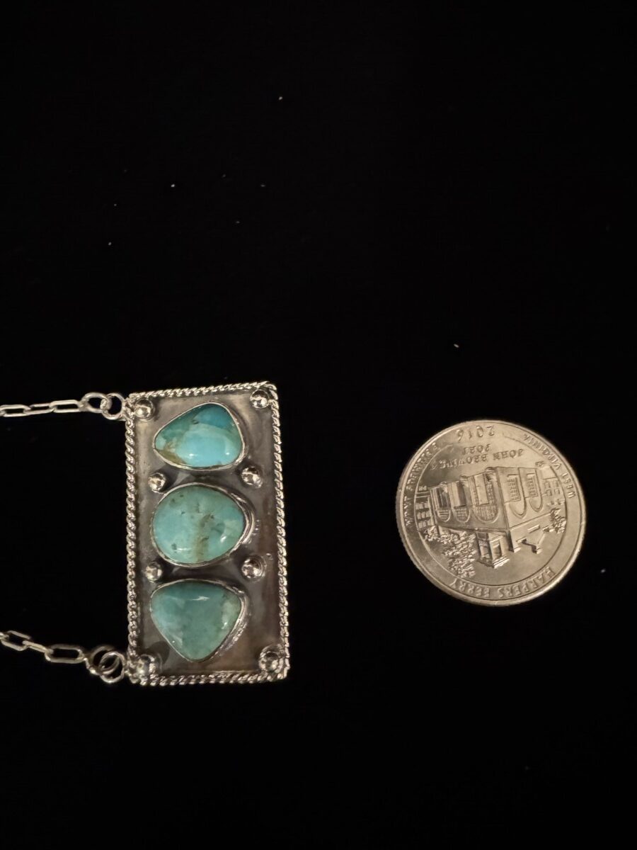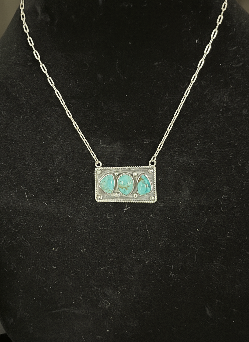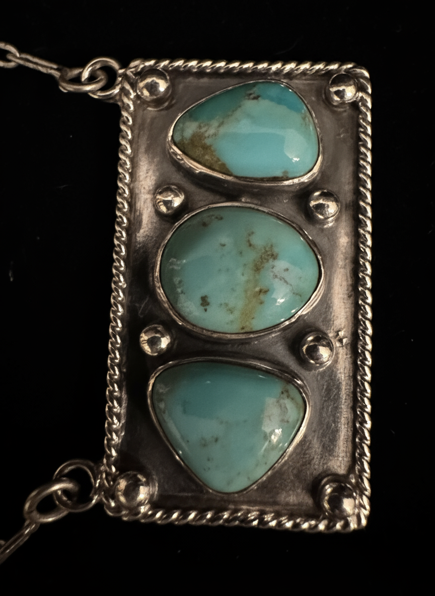 Stunning sterling silver and turquoise bar necklace. Featuring three beautiful pieces of natural turquoise set in stunning sterling silver. Close back. Well crafted