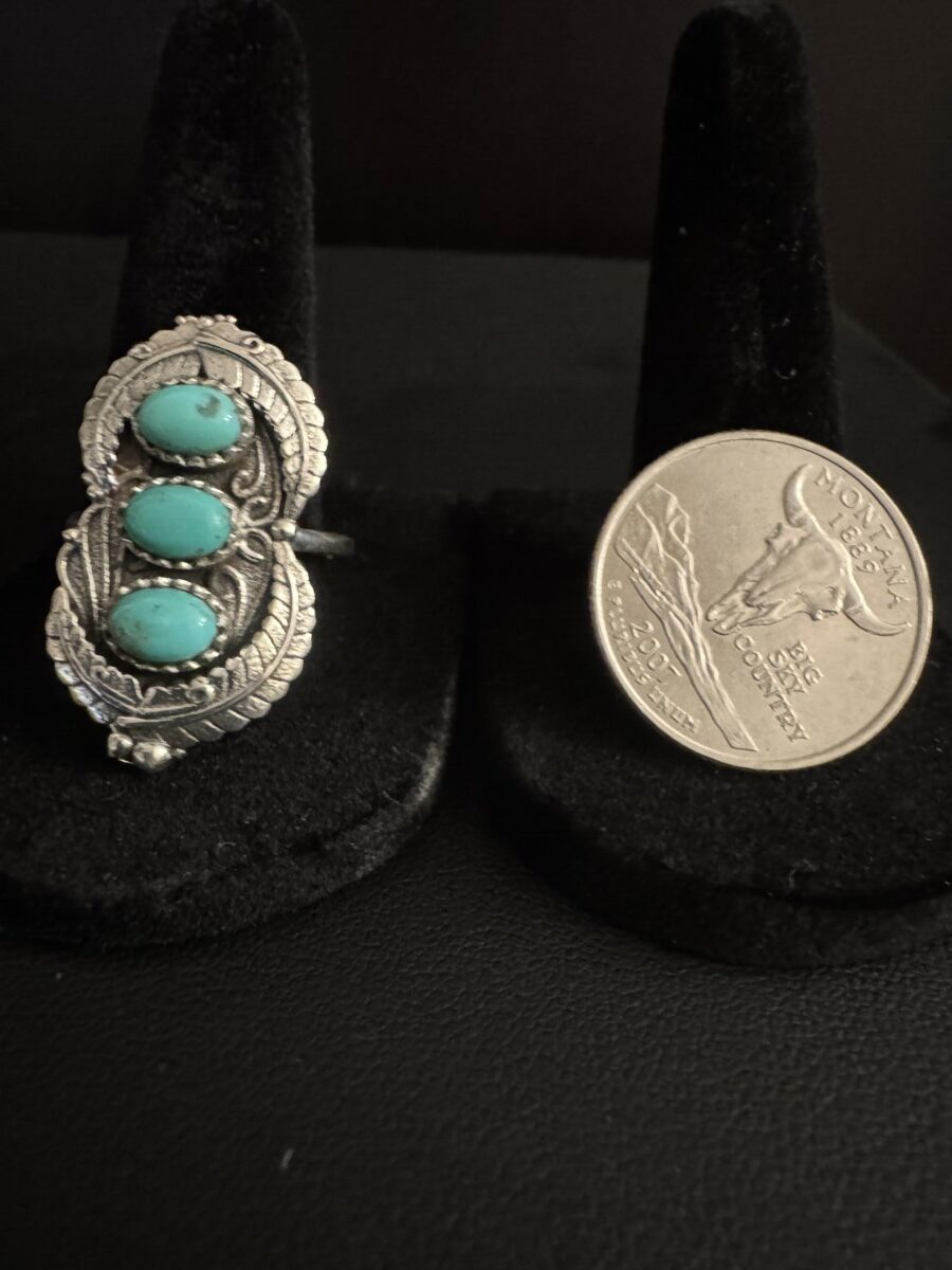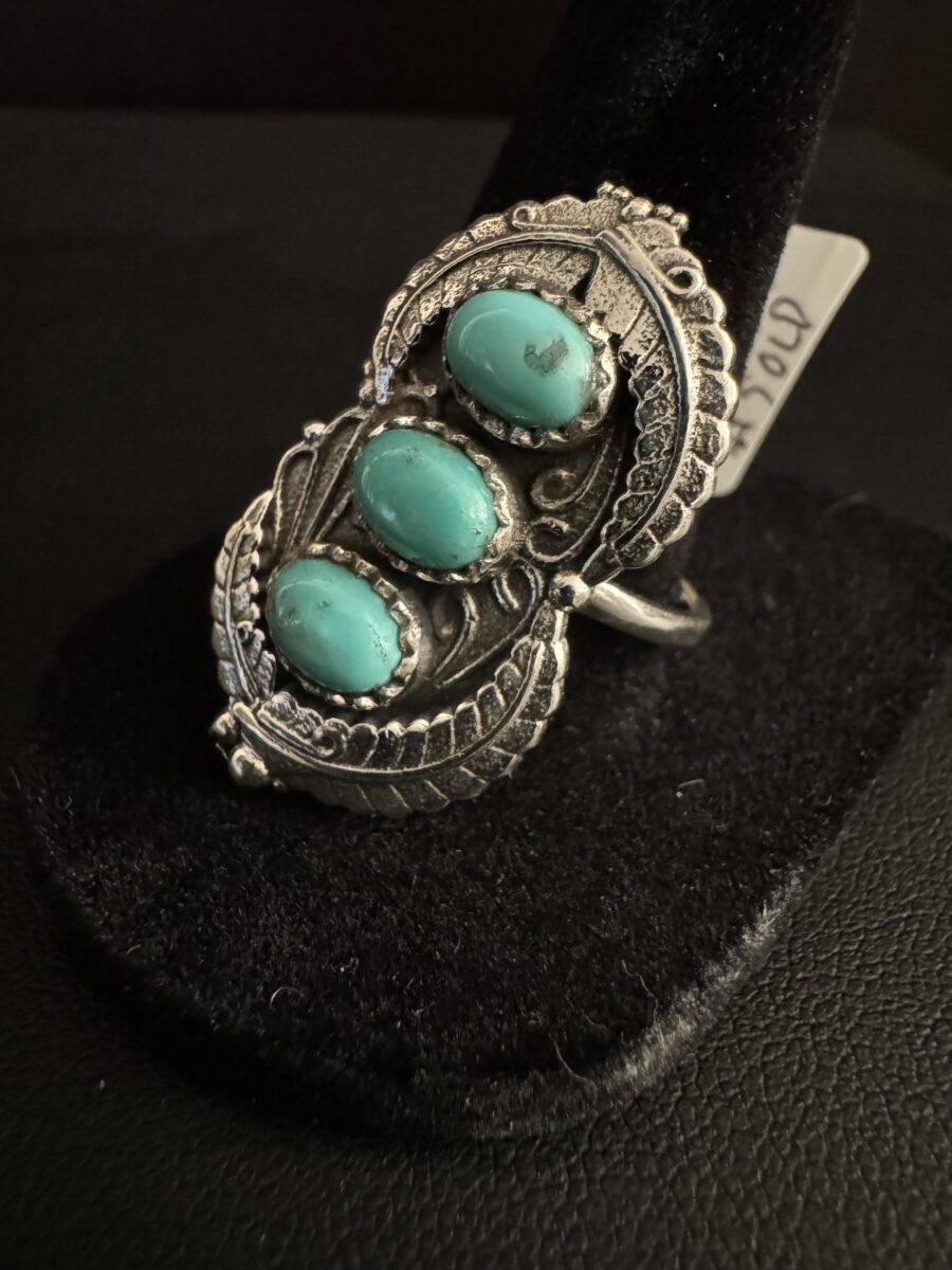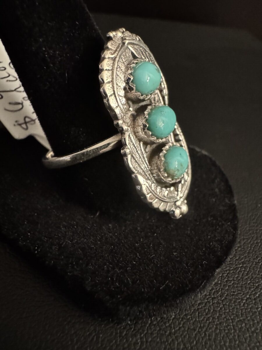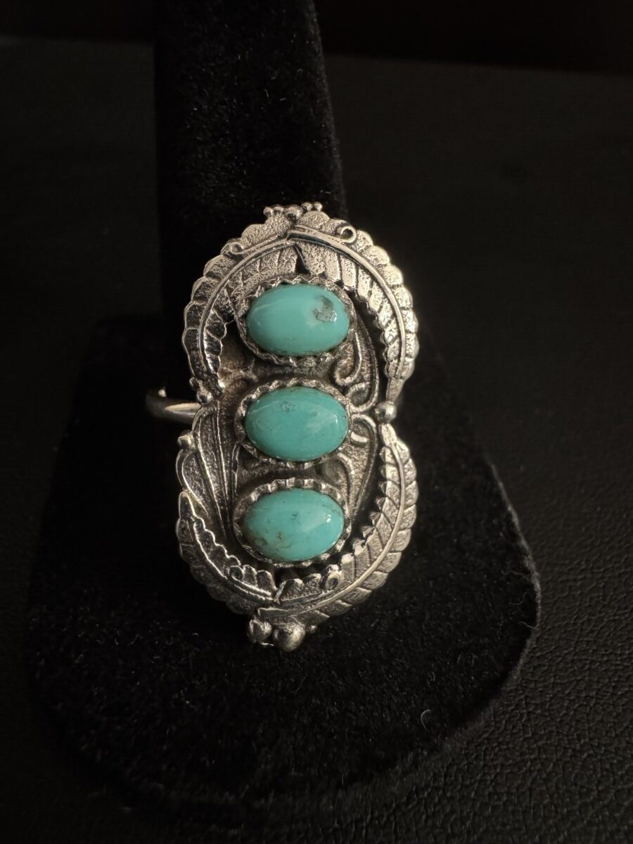 Beautiful, intricate sterling silver set with three pieces of oval turquoise. Size 10, that can be sized by any jeweler. Beautiful Native American style!!