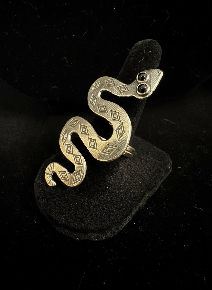 this is a beautiful sterling silver snake ring. It has black on its eyes and is a large size snake. You will get me to complements on this stunning piece.
