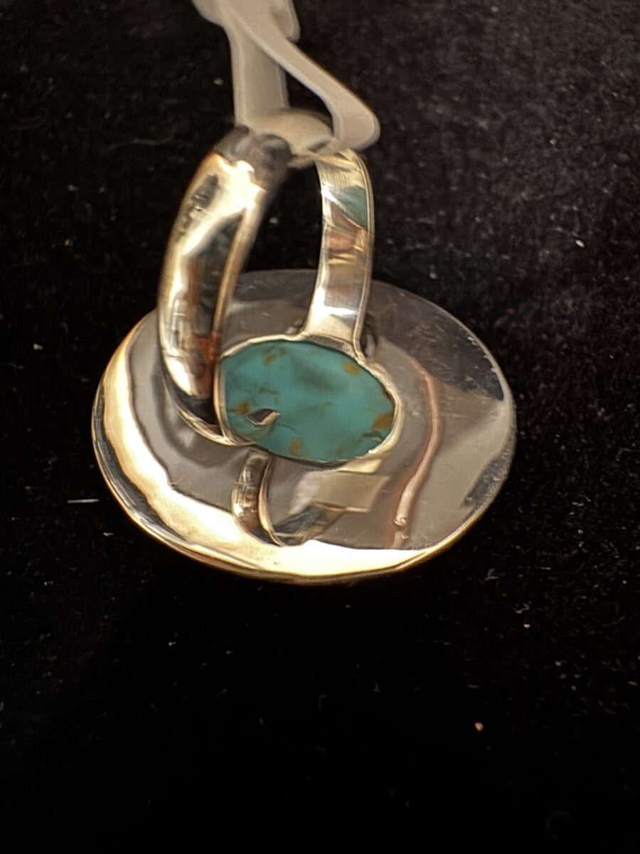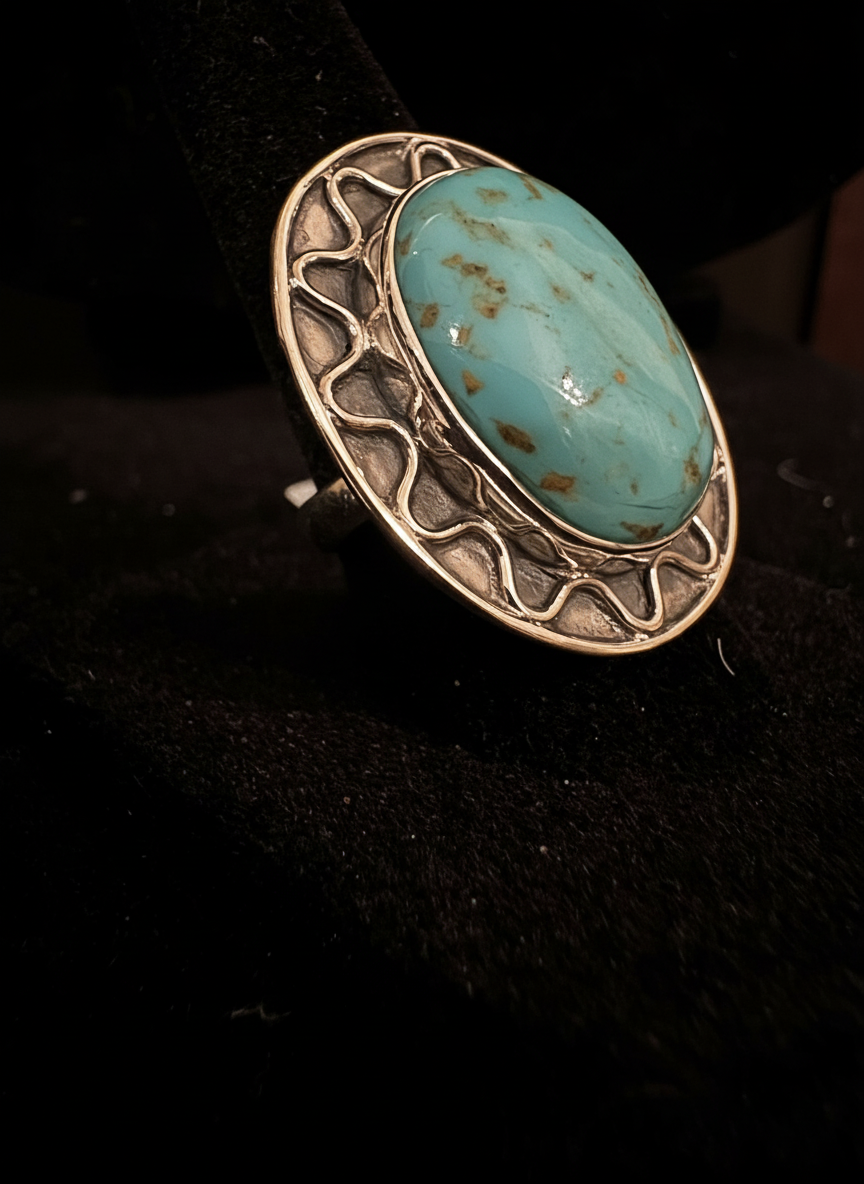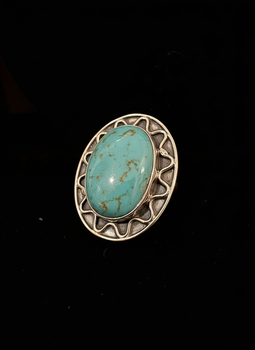This is a sterling silver beautiful ring set with an oval shaped turquoise. Very elegant.