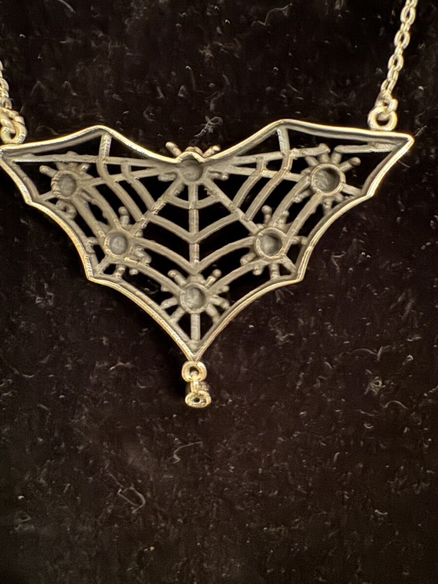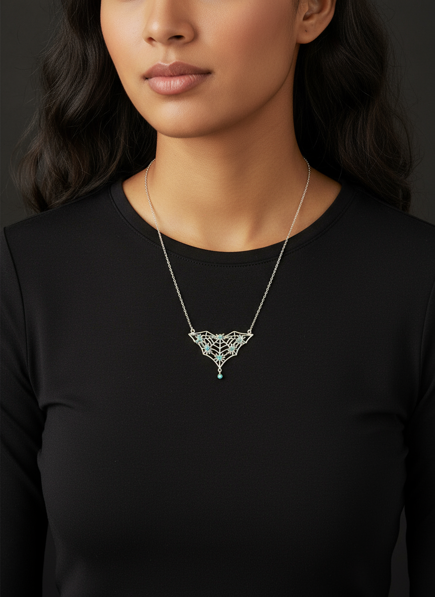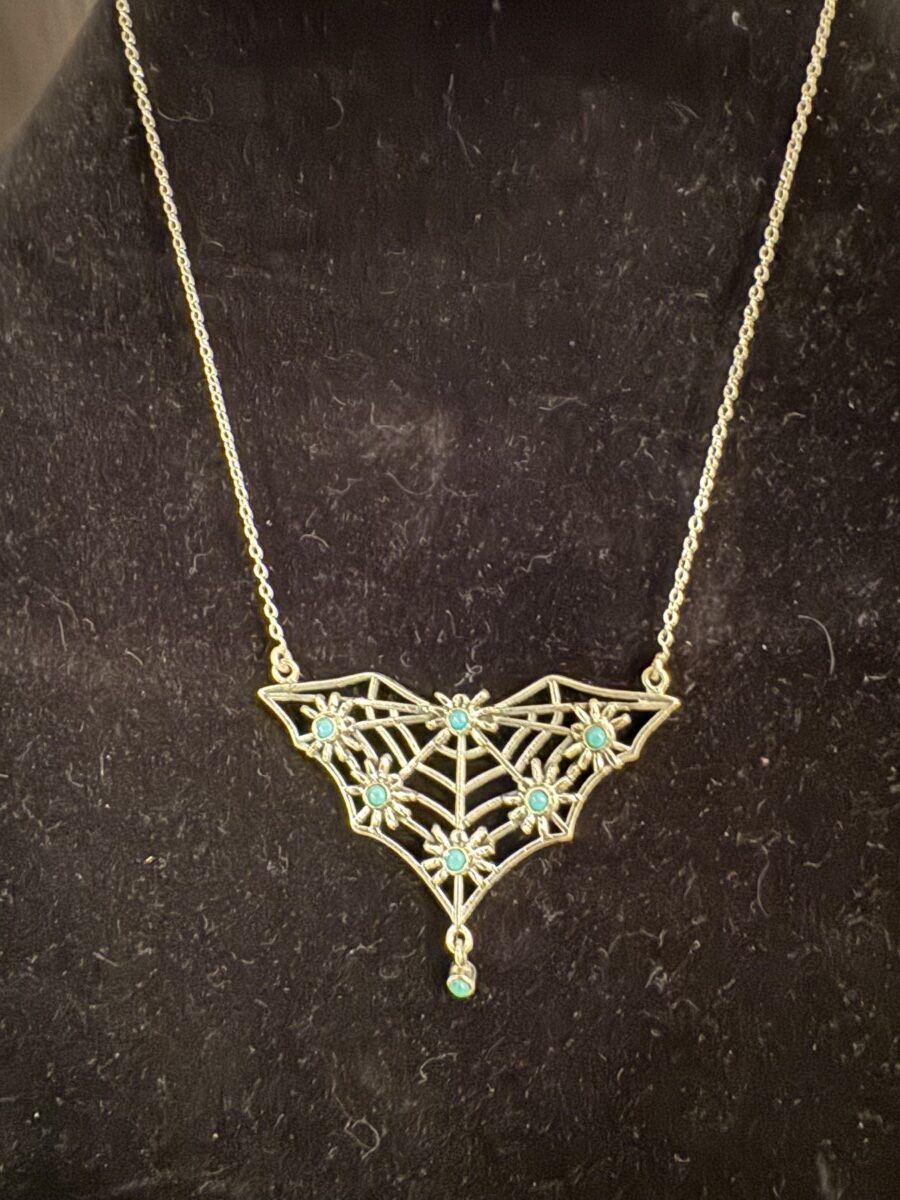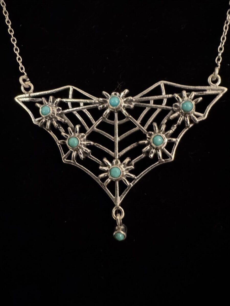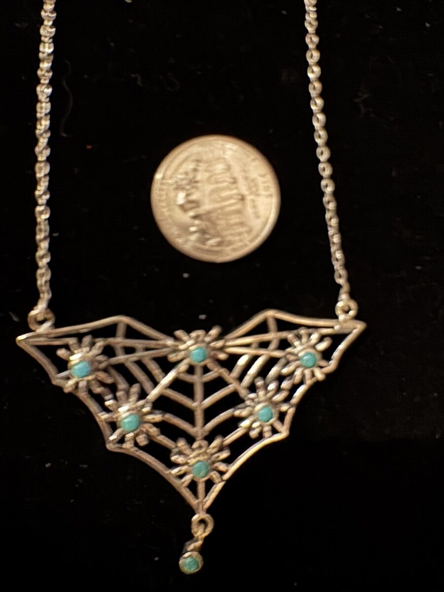 This is a beautiful spiderweb necklace with turquoise stones. Totally different. You will get many compliments. Sterling silver.