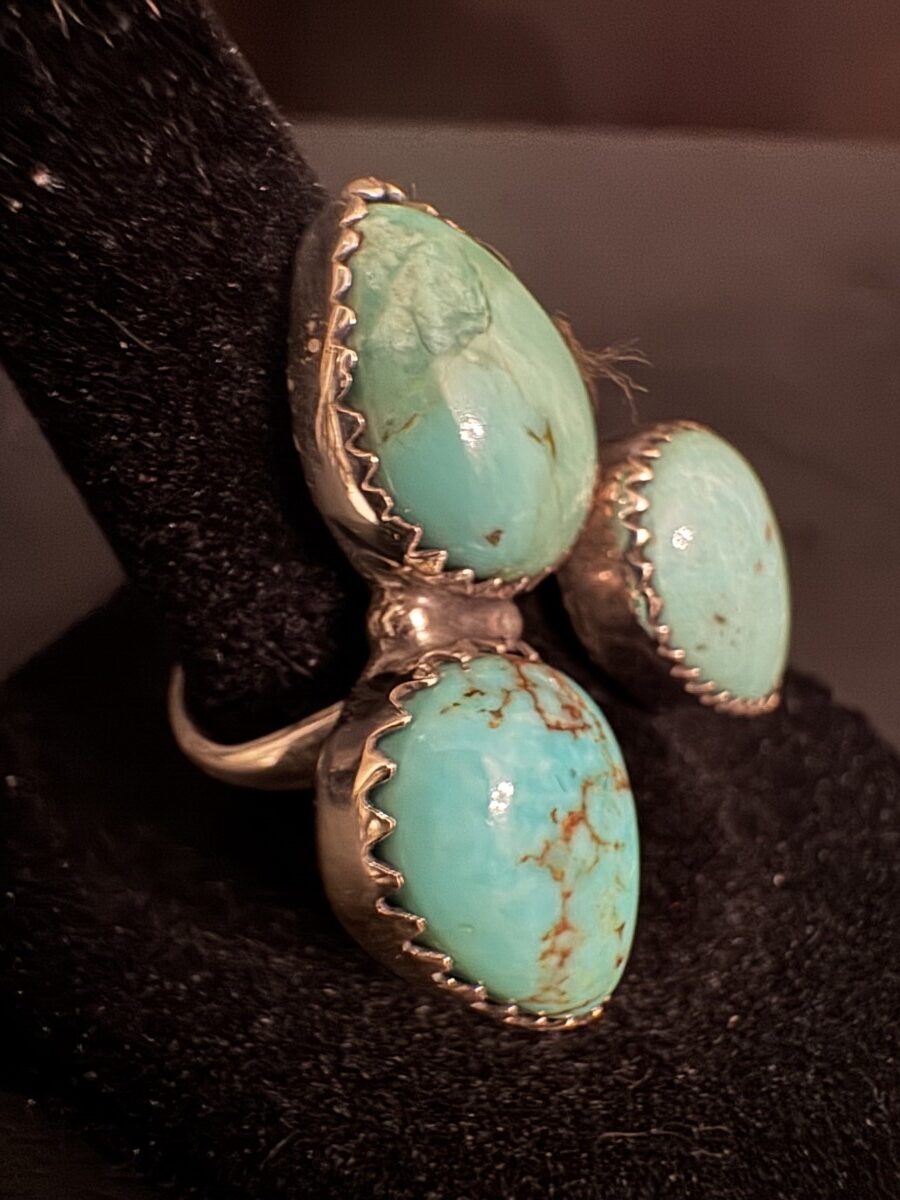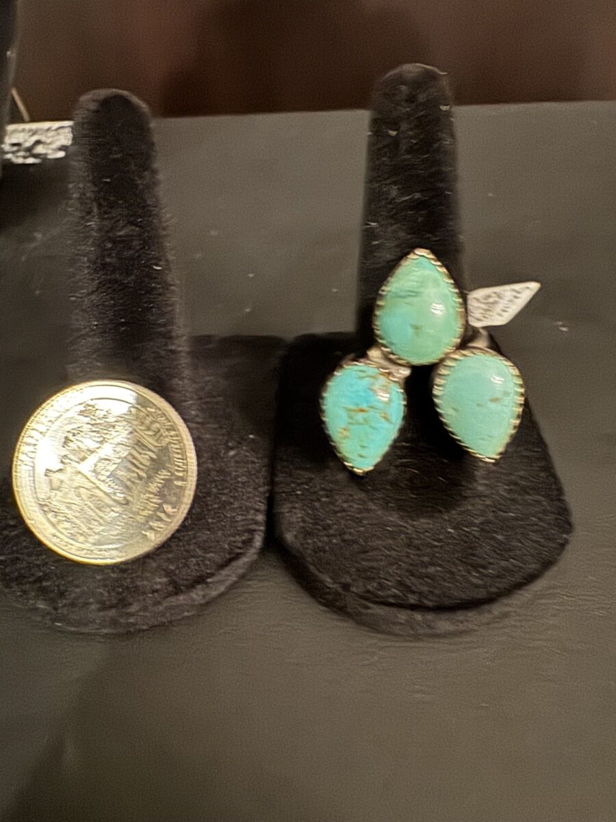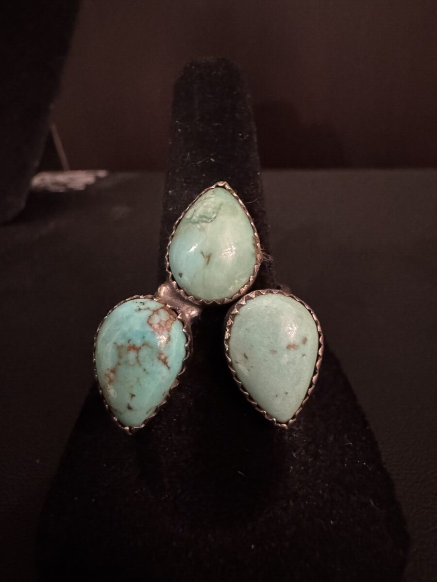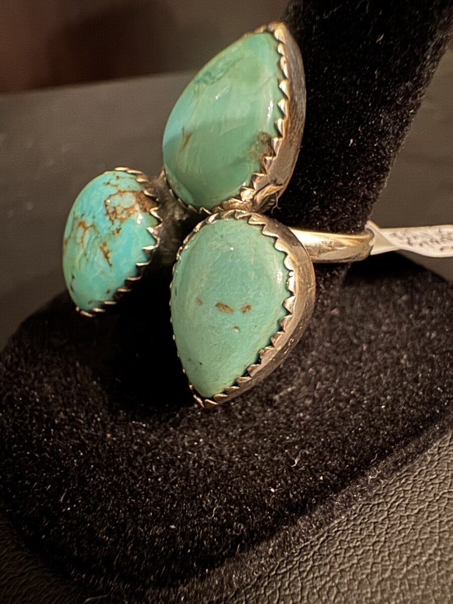 This is a beautiful turquoise ring with three pair shaped those set in a sterling silver setting size 7 and can be sized by a jeweler.