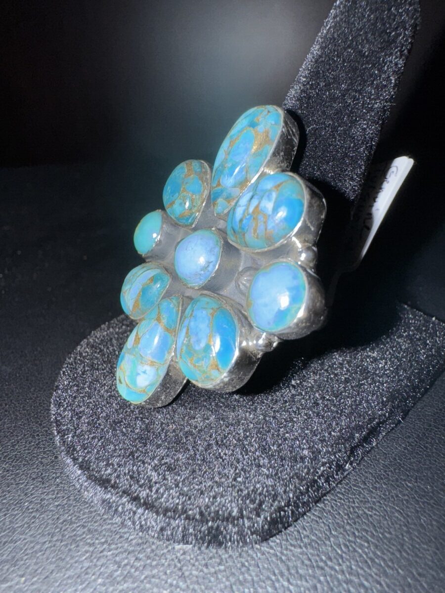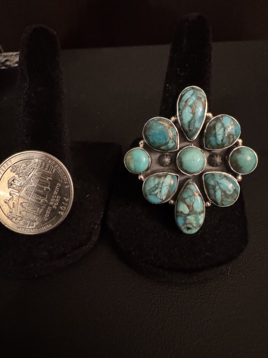 This is a stunning sterling silver and turquoise ring. Gorgeous stones and a lovely setting. Adjustable size