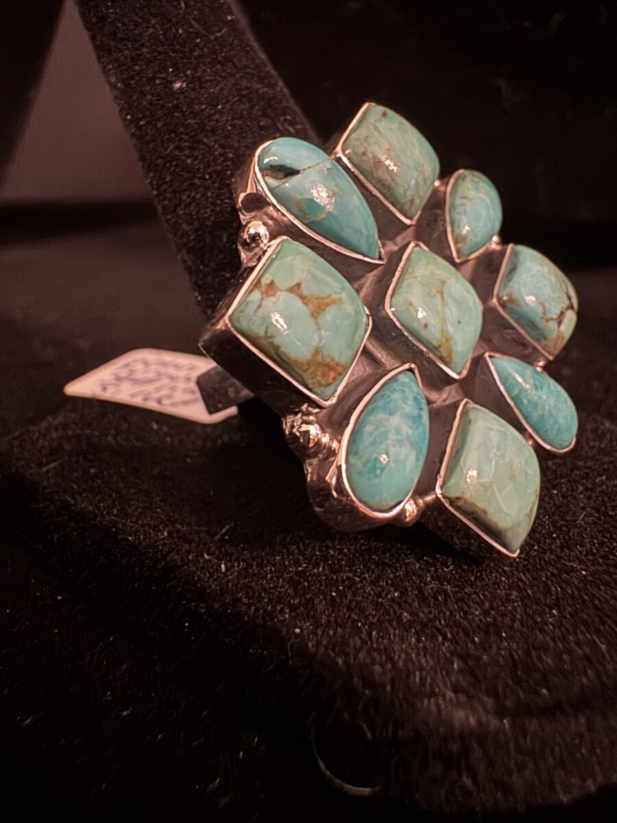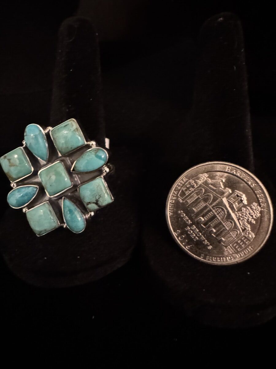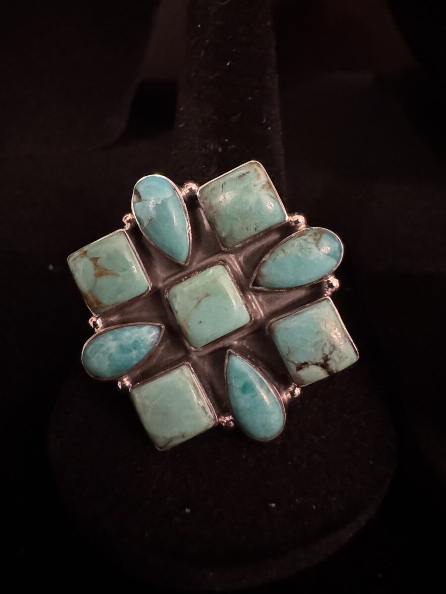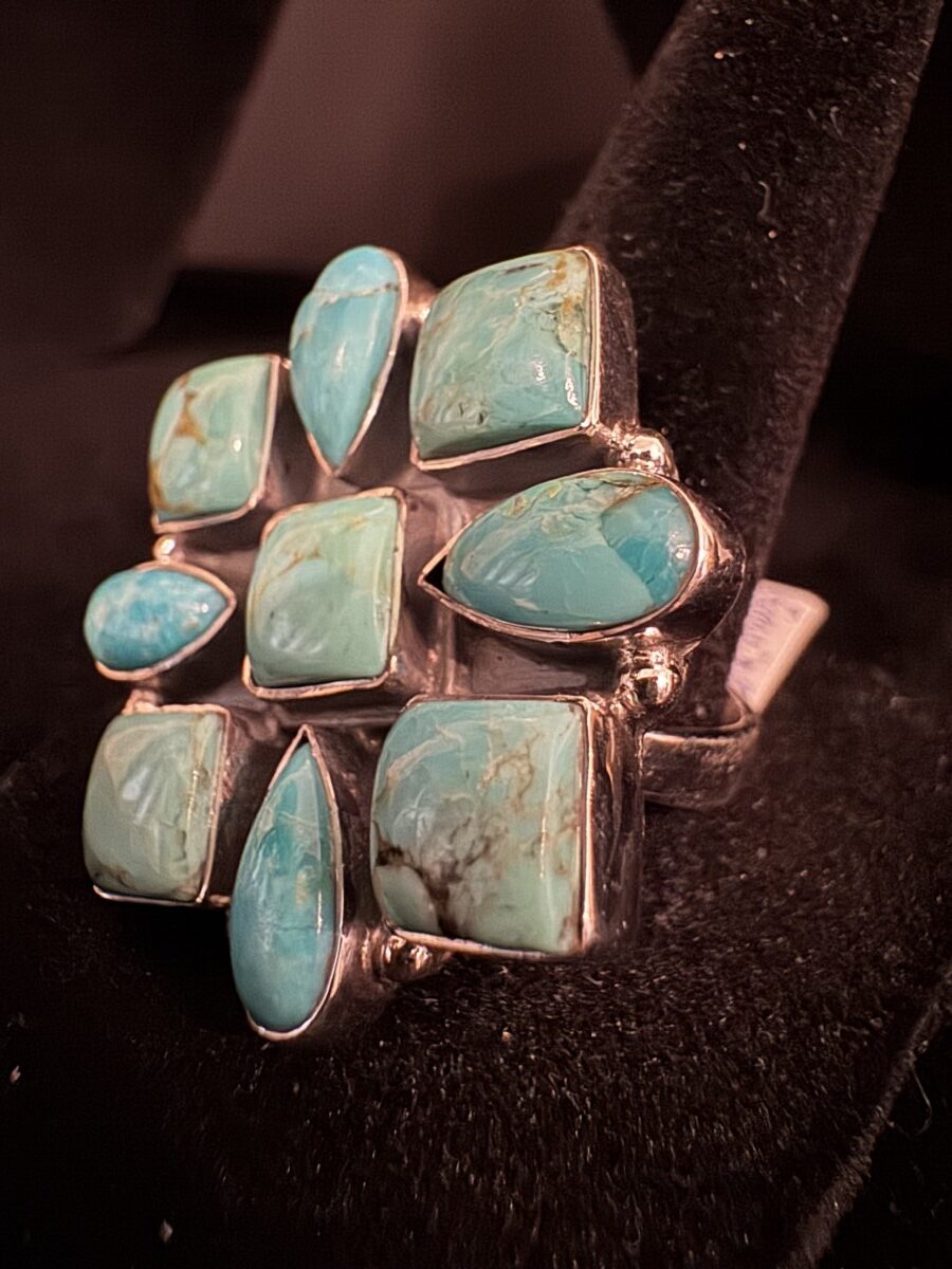 This is a beautiful sterling silver and turquoise ring set in an elegant setting. Adjustable size