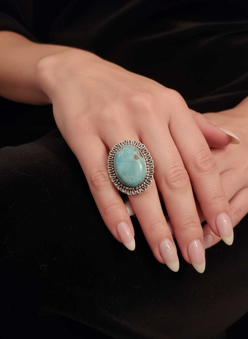 This is a beautiful turquoise and sterling silver ring. Definitely a statement piece! Adjustable size