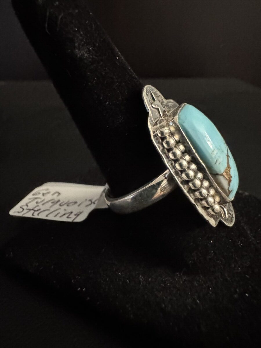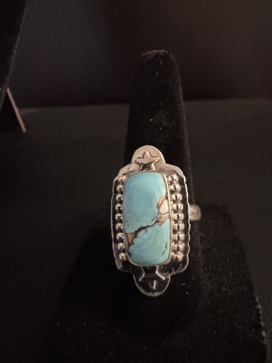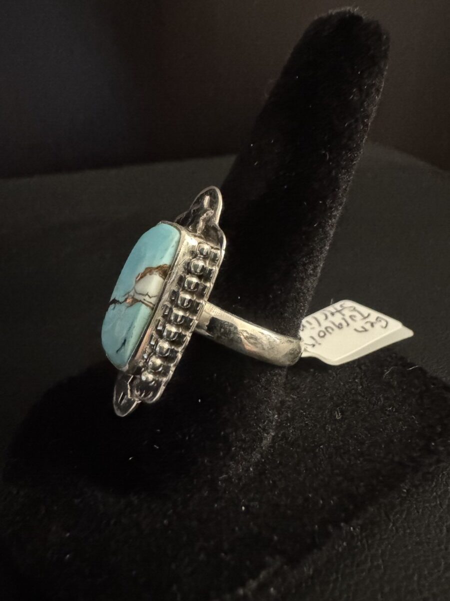 This is a beautiful rectangular shaped turquoise in an intricate sterling silver setting. Size 6 1/2