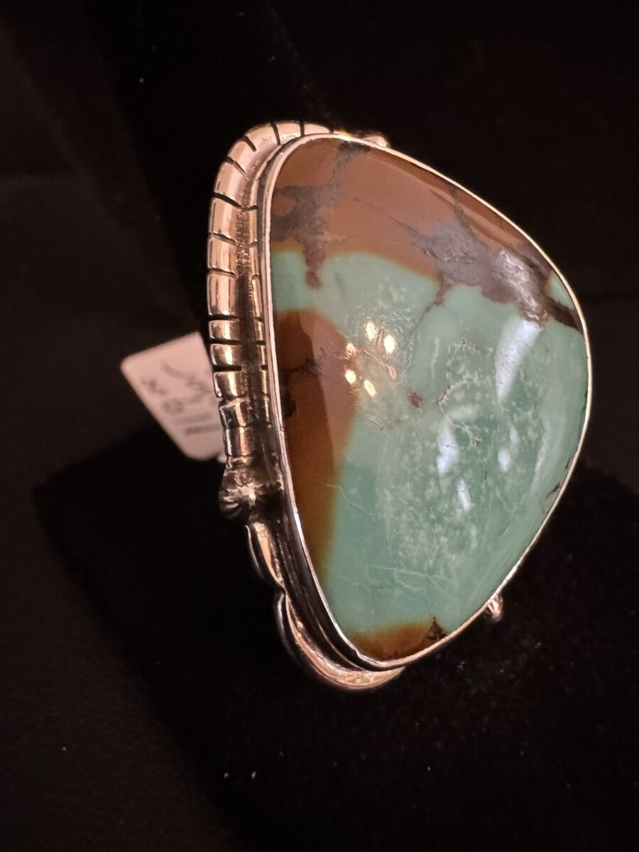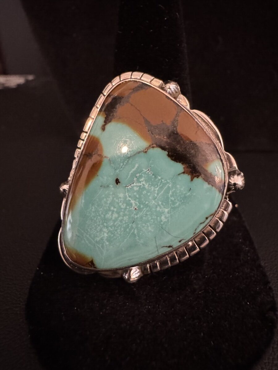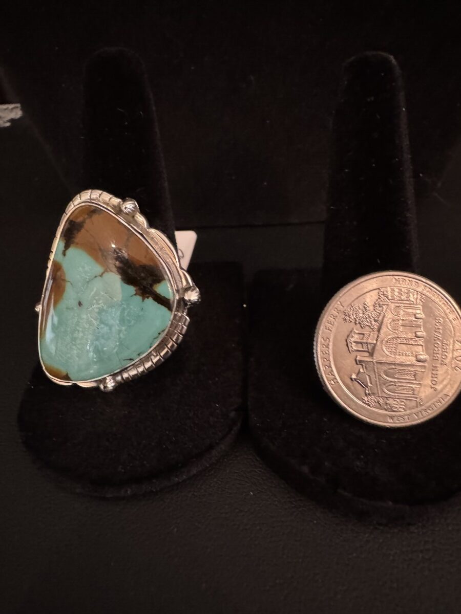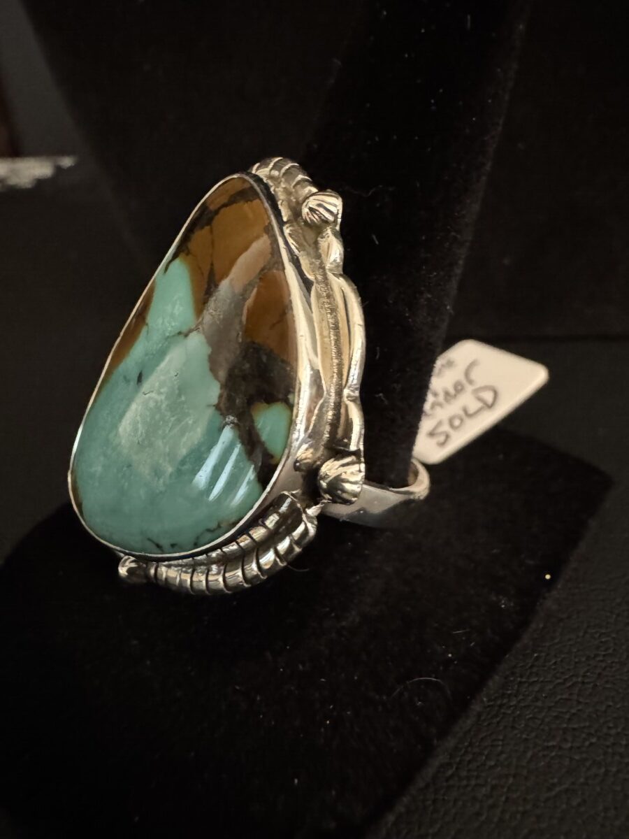 This is a beautiful piece of turquoise in a pair shape set in sterling silver mounting with beautiful details. You will love this piece and get many compliments when you wear it. Adjustable size