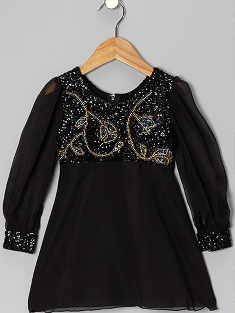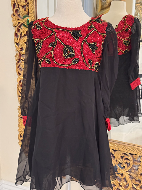 ADORABLE HAND BEADED DRESS WITH CHIFFON SKIRT AND CHIFFON SLEEVES.  HAND BEADED CUFFS AND BACK ZIPPER.  FABRIC IS STRETCH ON TOP FOR A SUPER FIT AND THE QUALITY IS EXCELLENT!