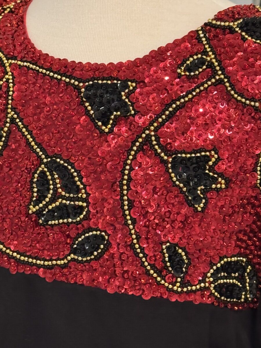 THIS IS AN ADORABLE RED AND BLACK HAND BEADED SEQUIN DRESS WITH CHIFFON SLEEVES AND SKIRT IN BLACK. VERY WELL MADE–BEADS DO NOT COME OFF EASILY