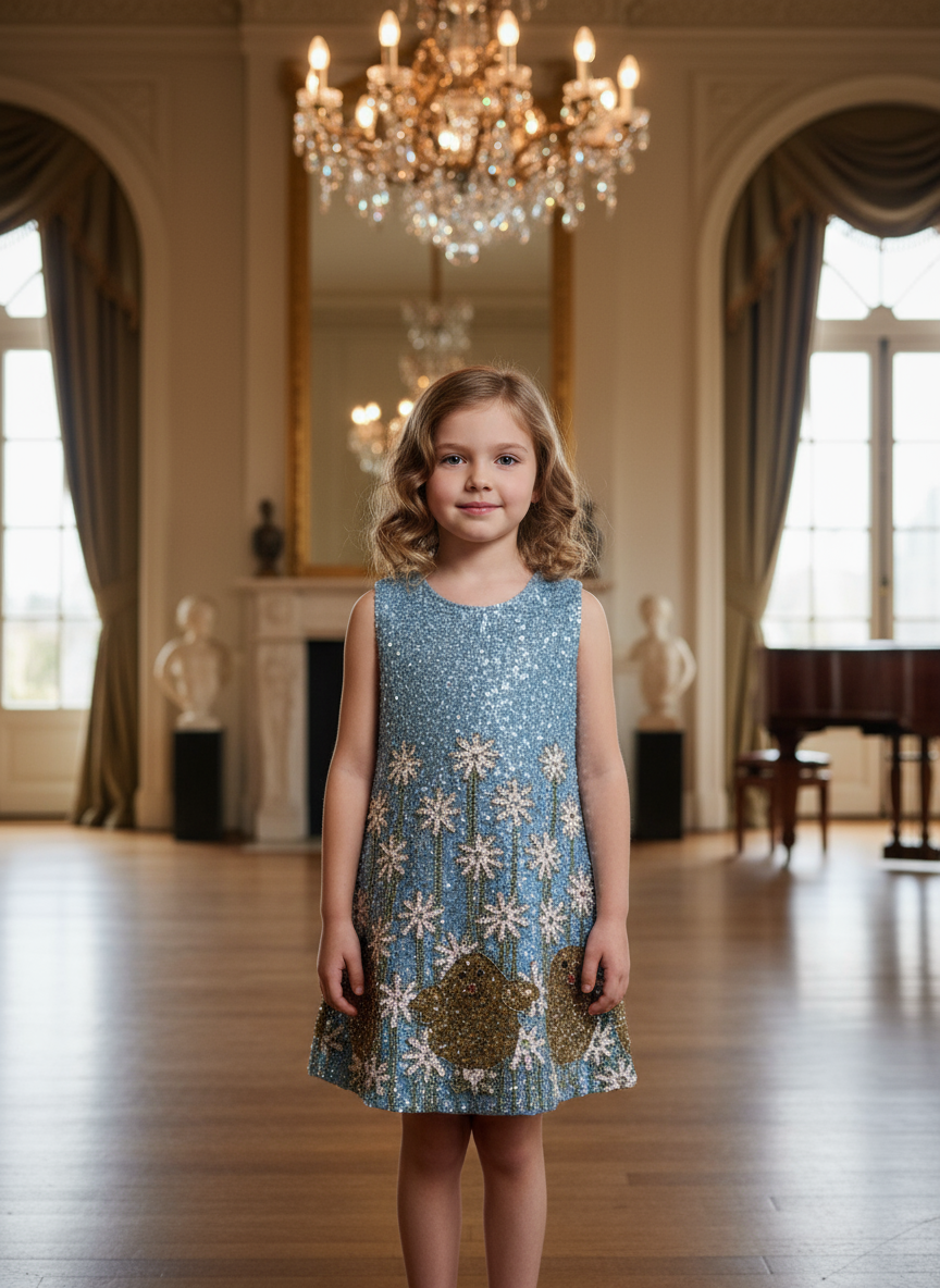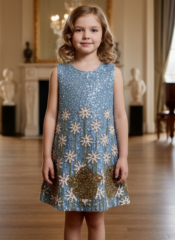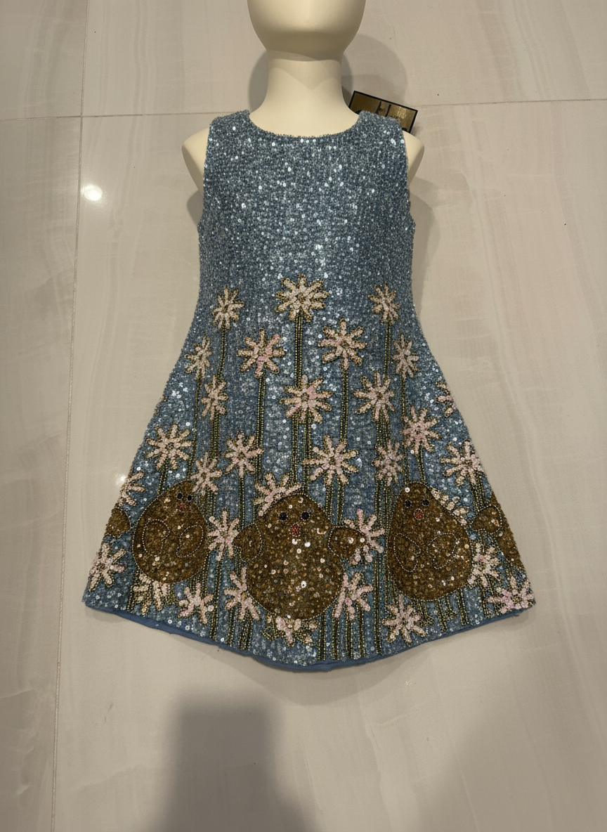 Adorable hand, beaded blue dress with yellow chicks and white flowers.