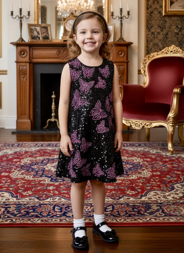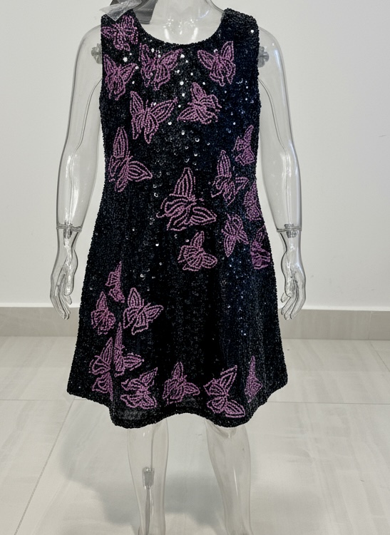BLACK WITH PINK BUTTERFLIES SEQUIN DRESS