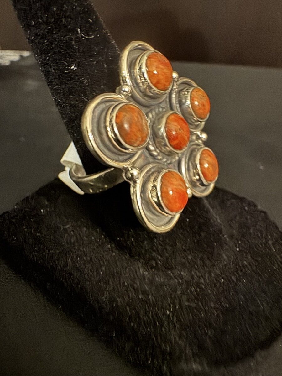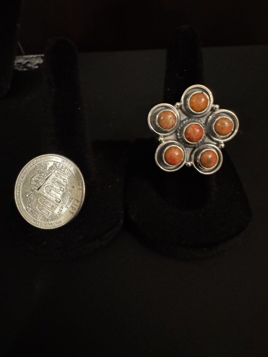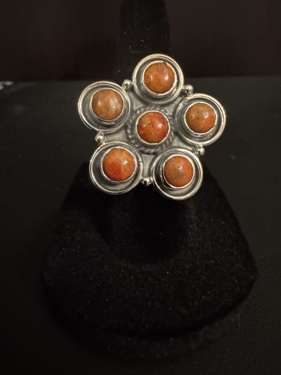 Beautiful orange desert Jasper set in a floral sterling silver setting. Adjustable size. High-quality setting