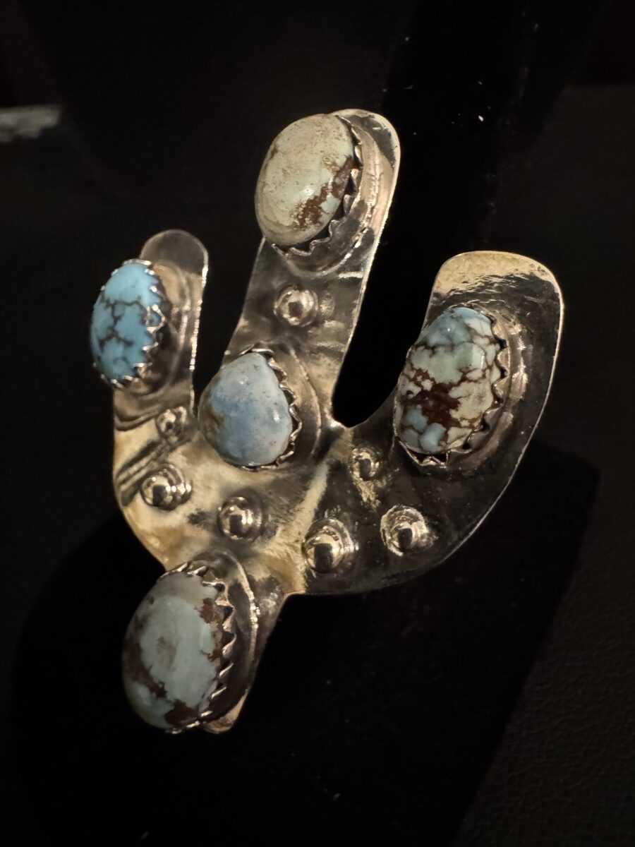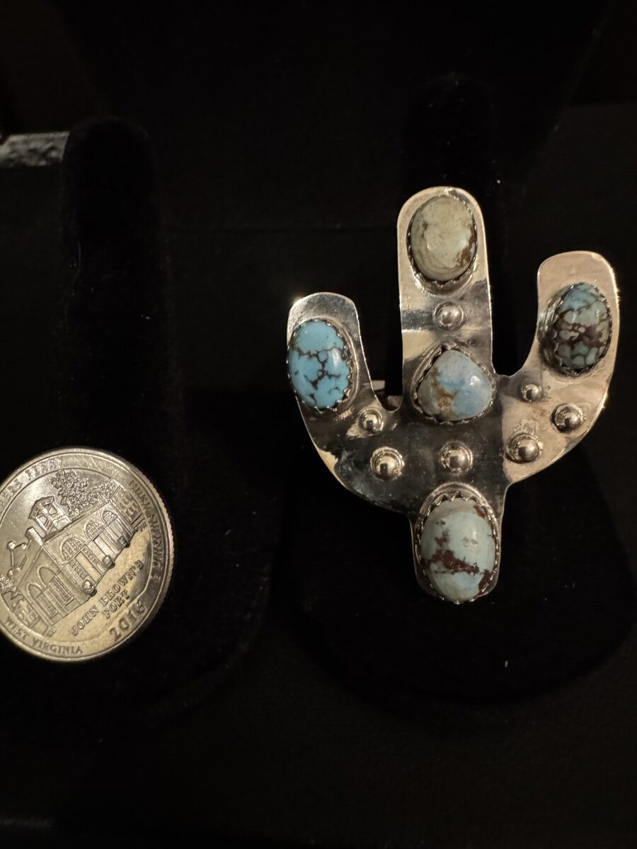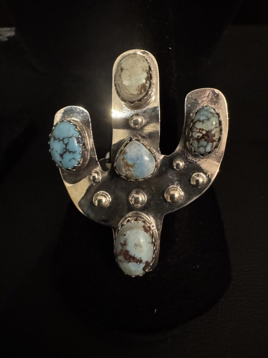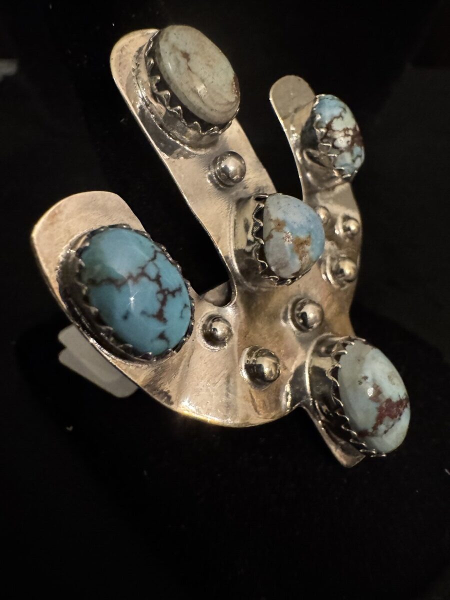 Beautiful sterling silver cactus ring set with beautiful turquoise stones. Closed back adjustable size
