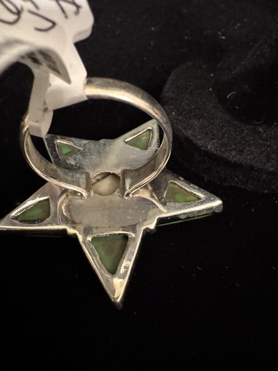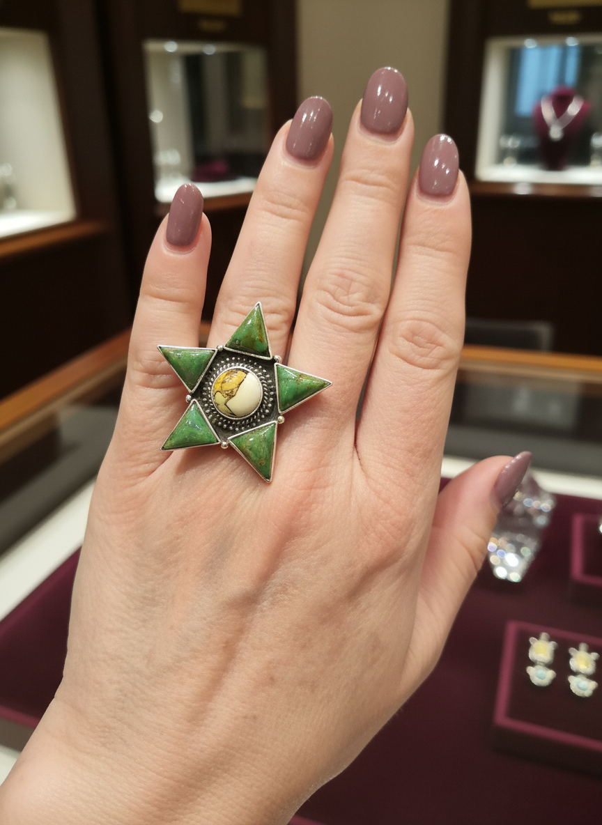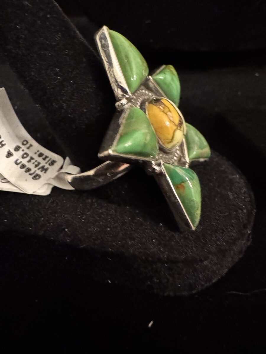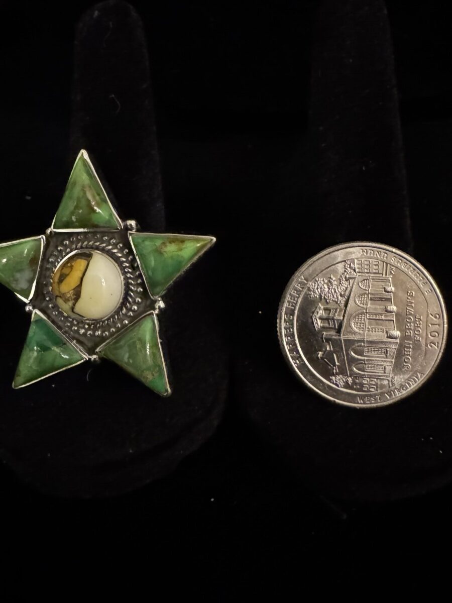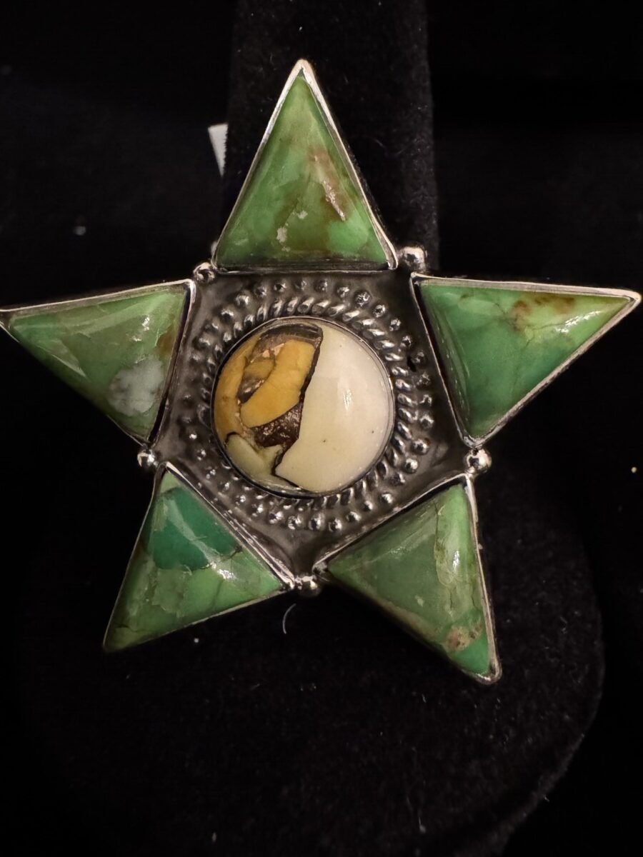 Beautiful pieces of green turquoise surrounding a honey Dolia stone. Set in Sterling silver. A definite conversation piece. Size 10, that can be sized by a jeweler