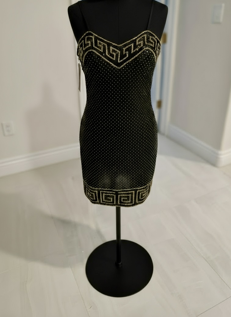 Beautiful hand, beaded black sequin with gold Greek key trim dress. Very durable and will work in your wardrobe for years to come