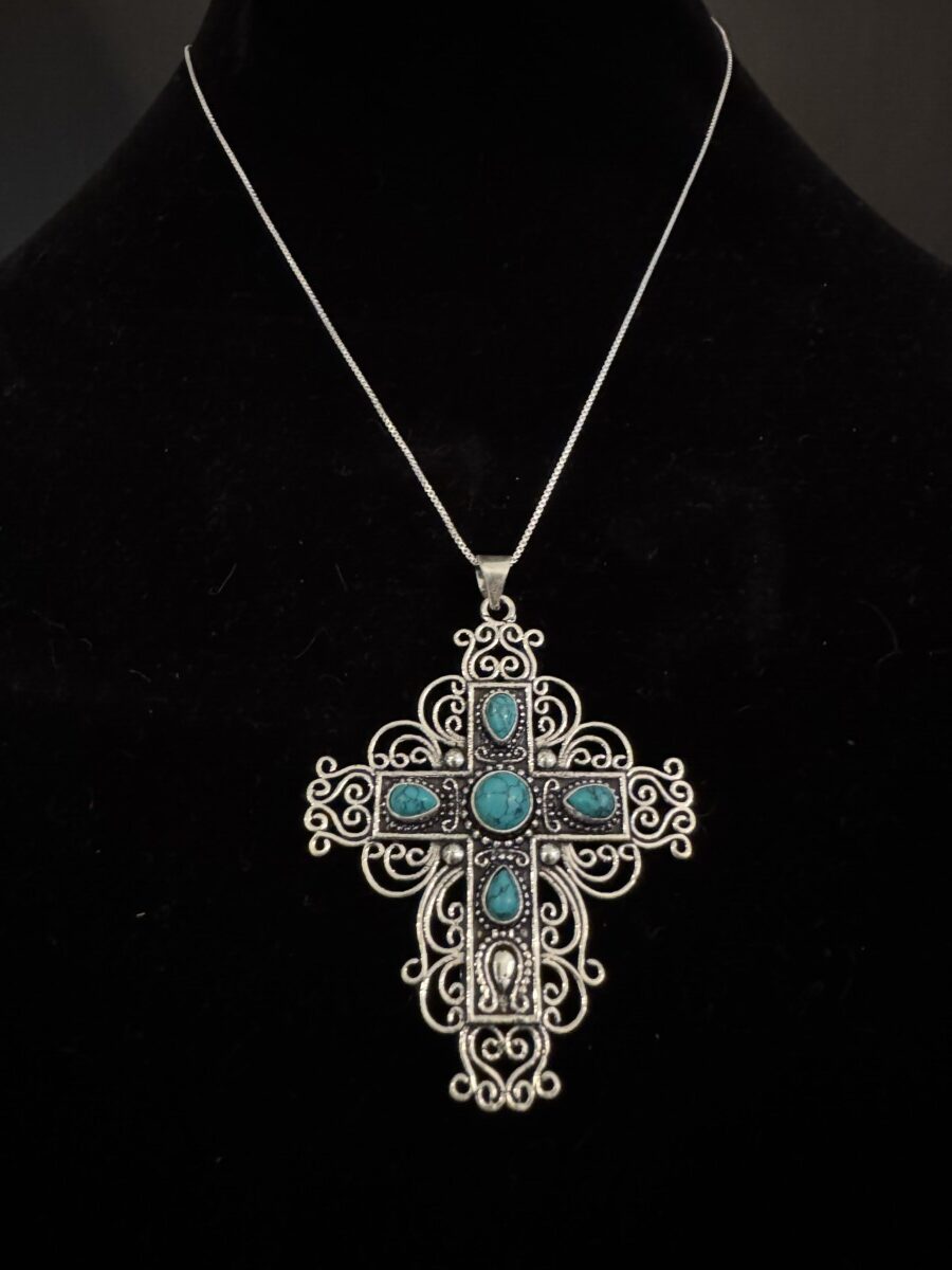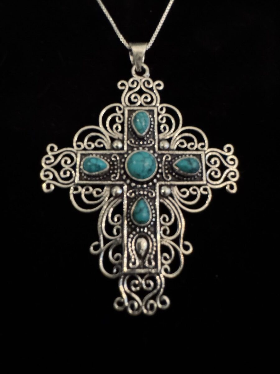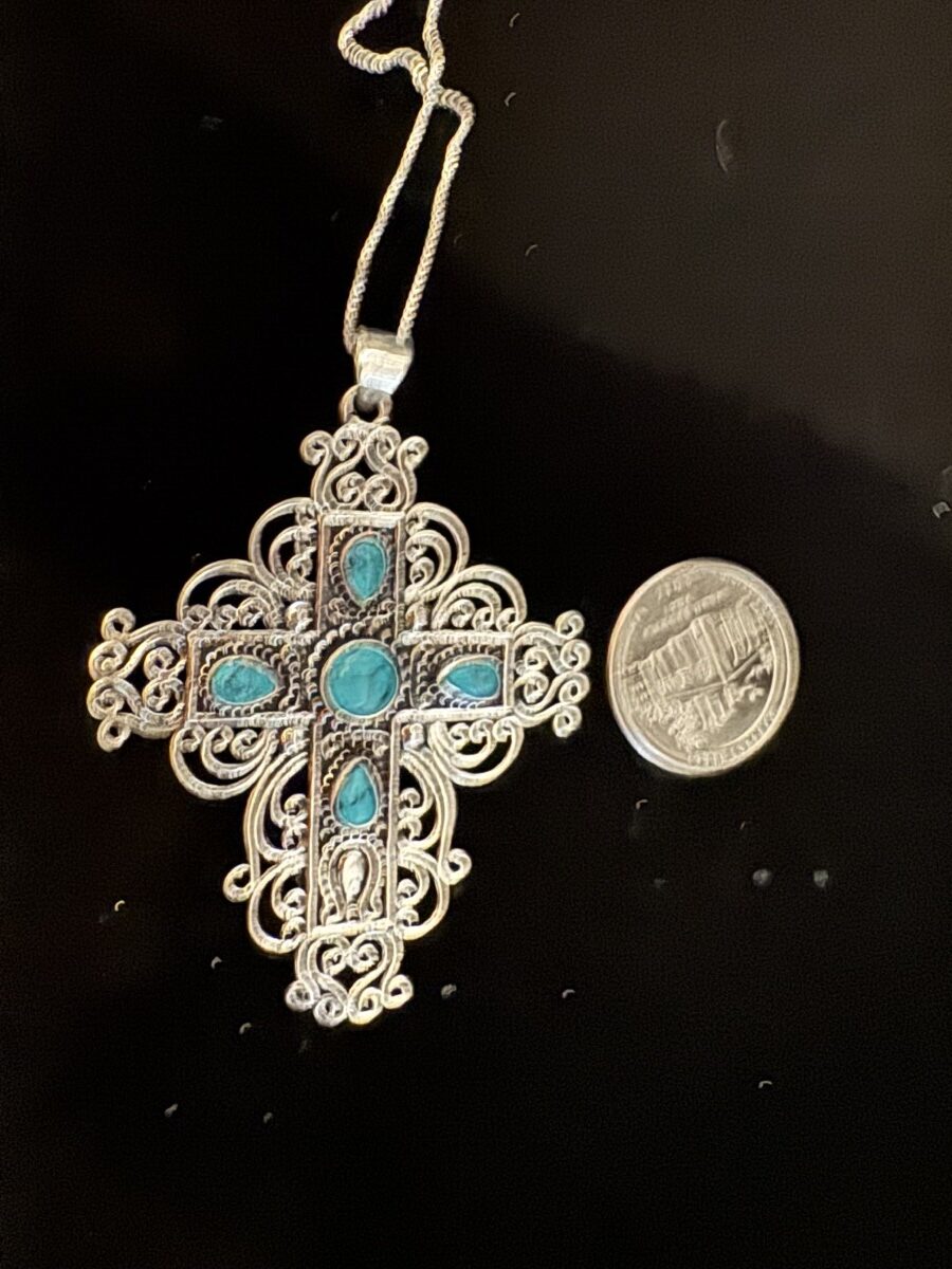 Beautiful intricate sterling silver Cross with turquoise stones. 18 inch chain included