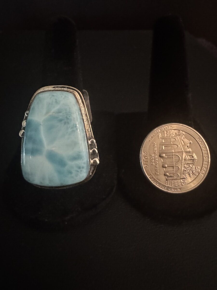 This is a beautiful large piece of Larimar in a stunning silver setting! Larimar is rare. This will be a piece you will treasure for years to come. Currently size 9, but any jeweler can size it up or down.