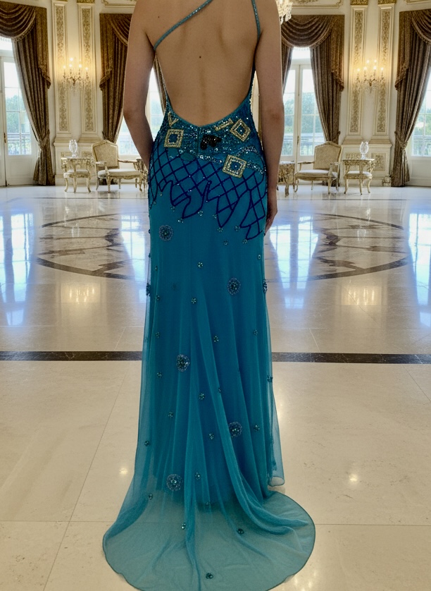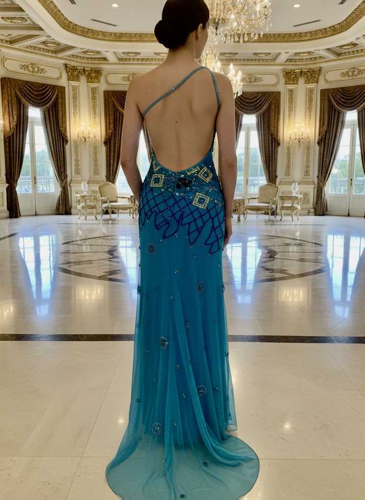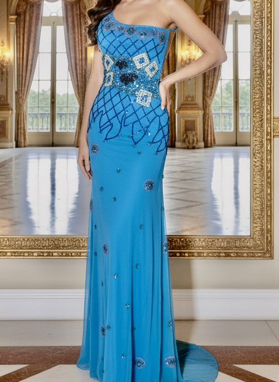 Beautiful, long turquoise, one shoulder dress. Hand beaded with an elegant array of beads and sequins. Made on power mesh stretch fabric for an easy fit power mesh consists of a stretch lining and a quality mesh net over the lining that is hand beaded. The attitudes dresses fit very well.
