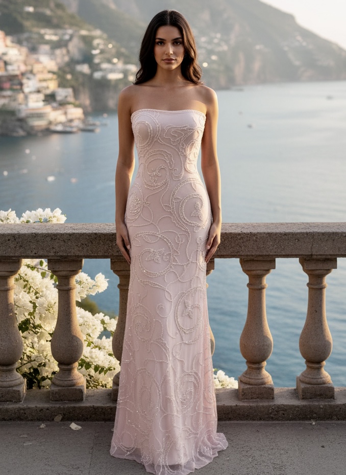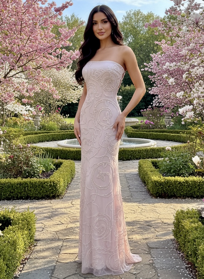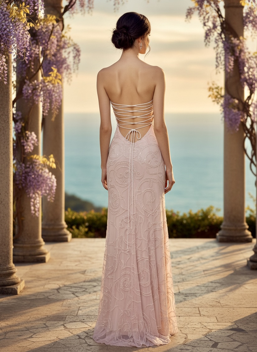 Beautiful strapless dress with lace down back. Made on power mesh for an easy fit. You will love this dress very classy