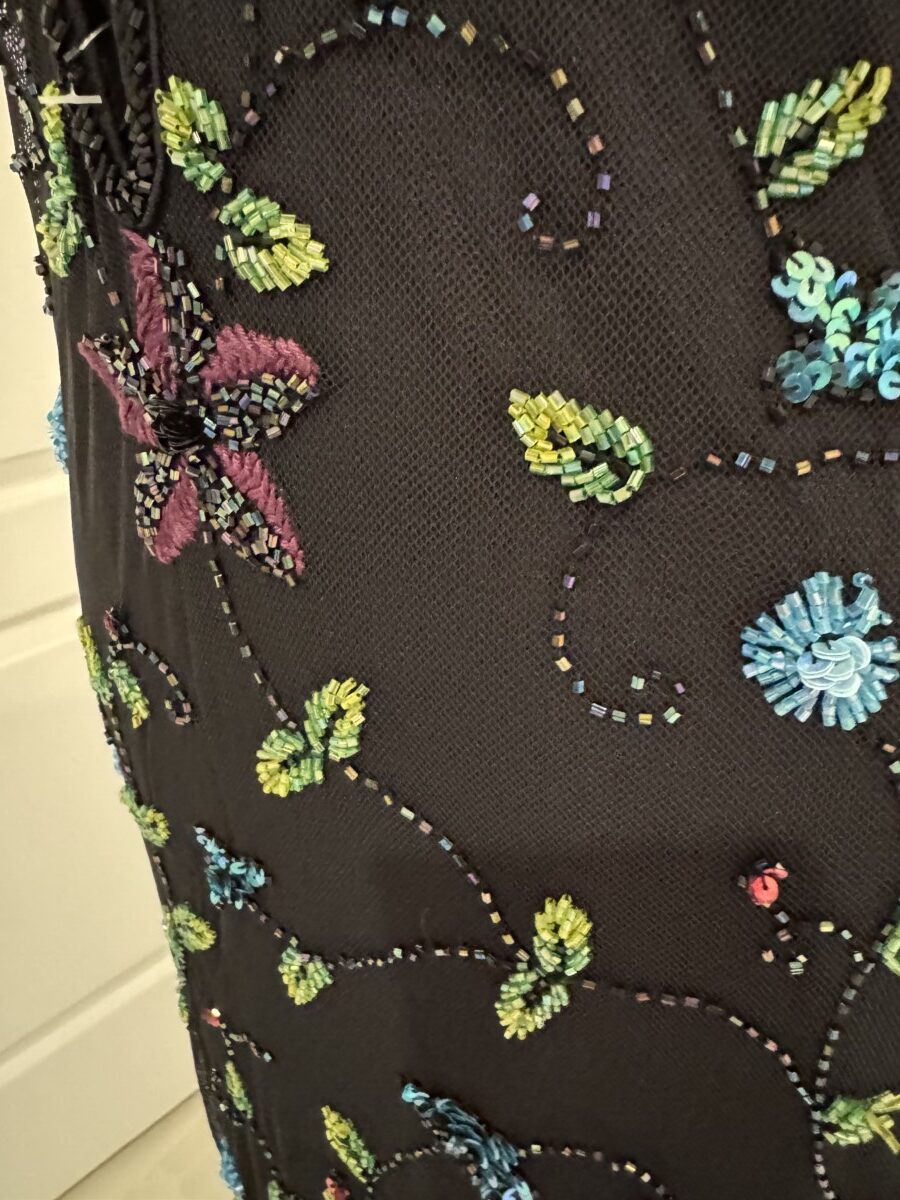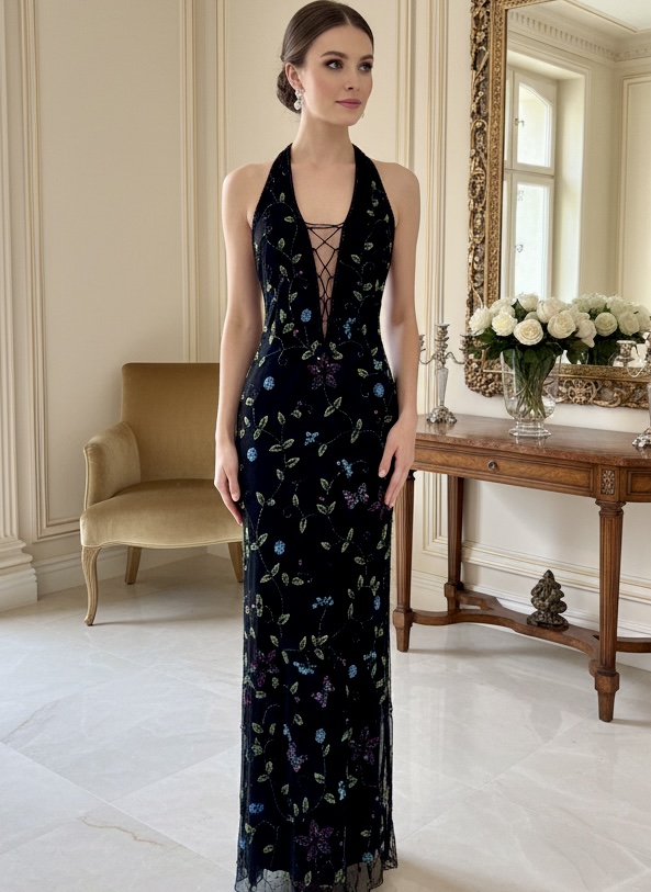 Beautiful hand, embroidered and beaded low front lacing down and low back lacing down. Made on power mesh base for a great fit