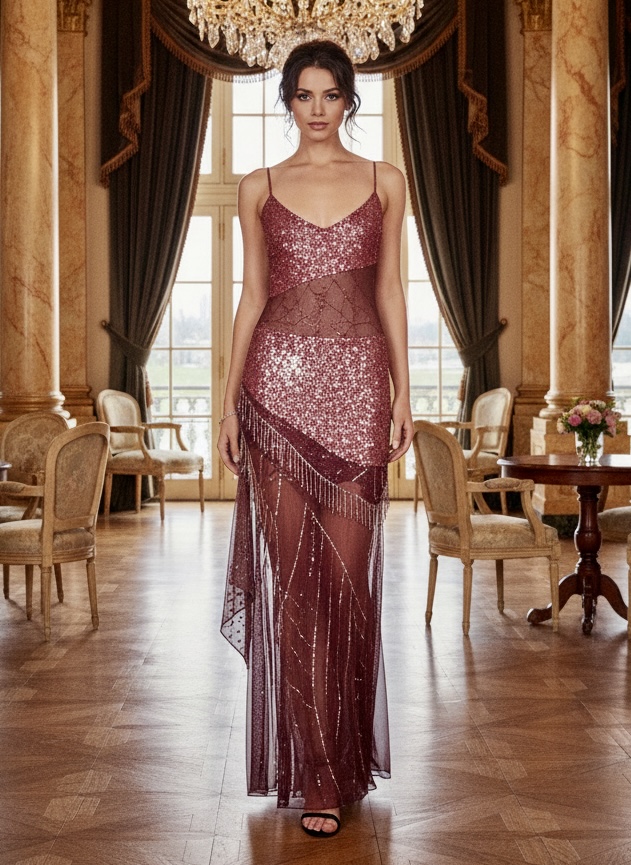 Beautiful long dress with high slit. She midriff and skirt. Every head will turn when you walk in the room wearing this gorgeous dress. Power mesh stretch base material. For an easy fit
