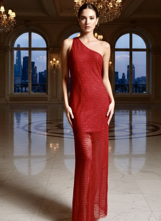 Beautiful long one shoulder dress with shear mesh bottom. Hand beaded and low rounded back make for an elegant dress. On Power mesh base. For easy fit