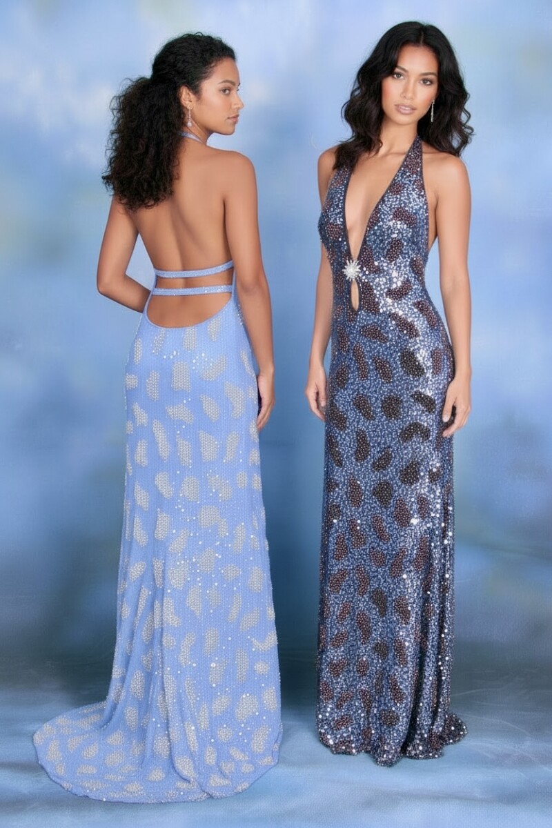 LONG FULL HEAVILY BEADED DRESS WITH RHINESTONE BROACH AND LOW BACK