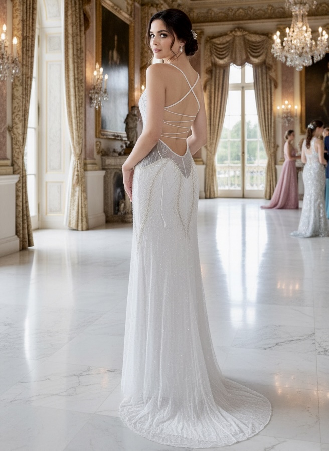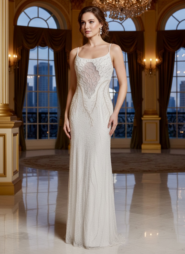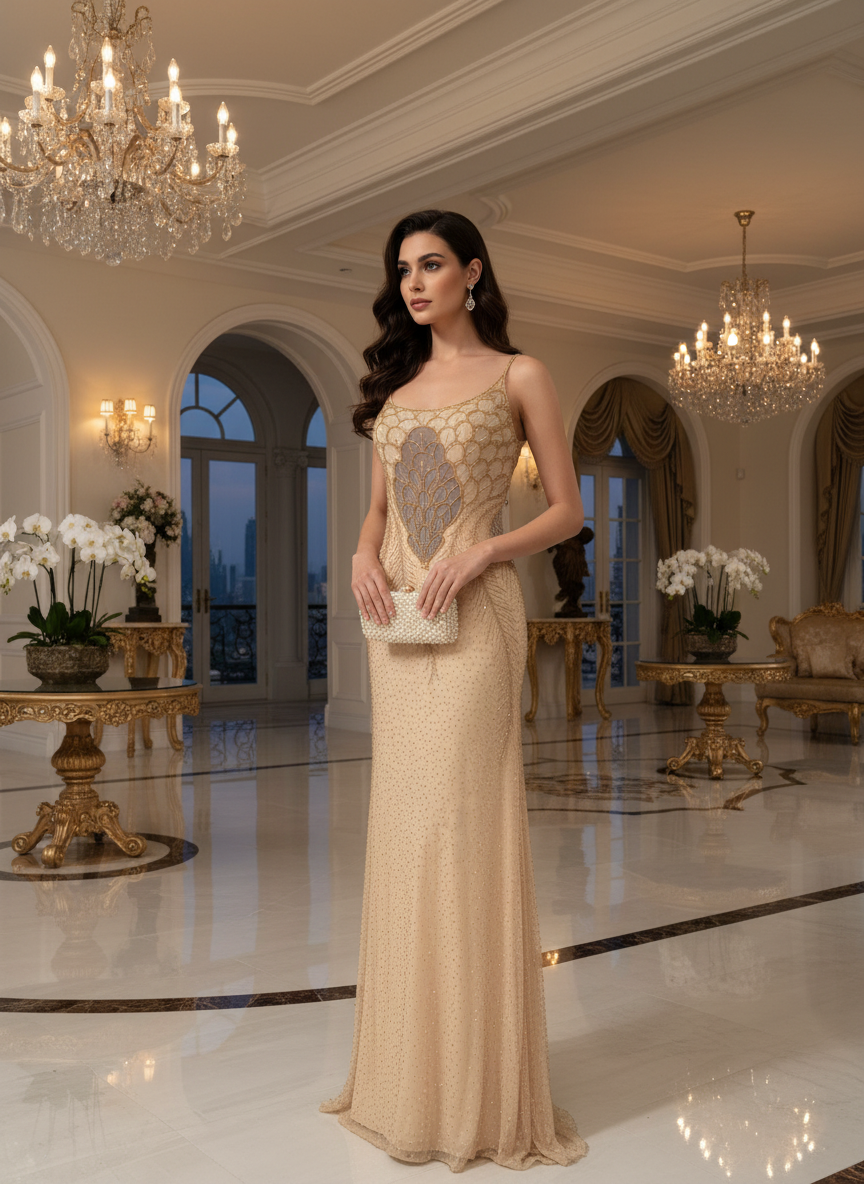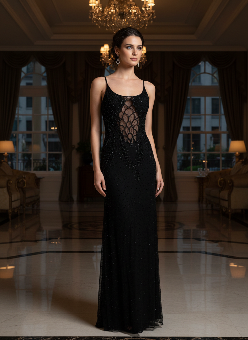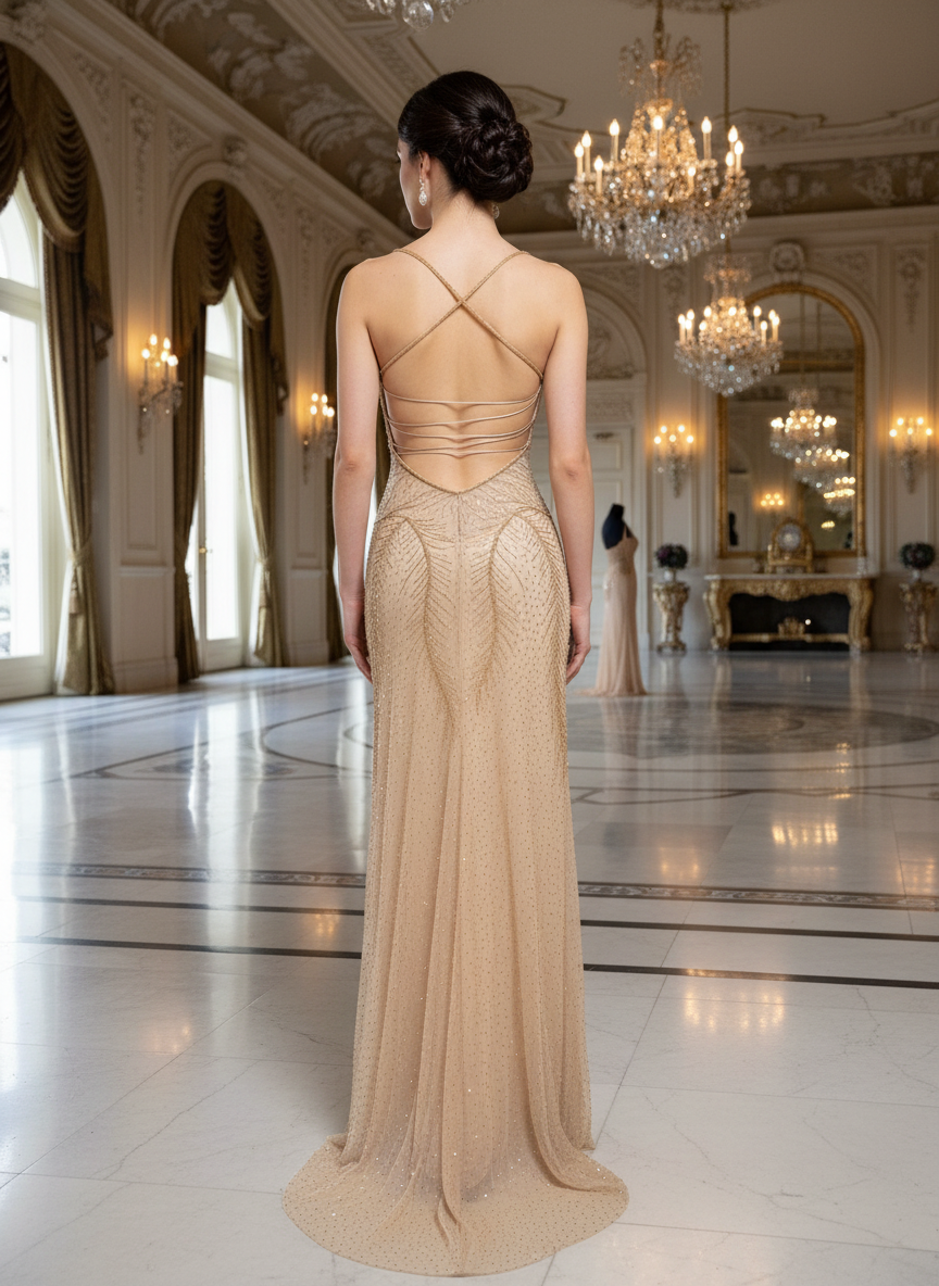 BEAUTIFUL LONG GOWN WITH LACE DOWN BACK HAND BEADED FEATHER DESIGN–SHEER MIDRIFF AND BACK MAKE FOR A STUNNING DRESS!