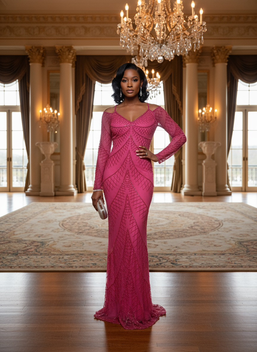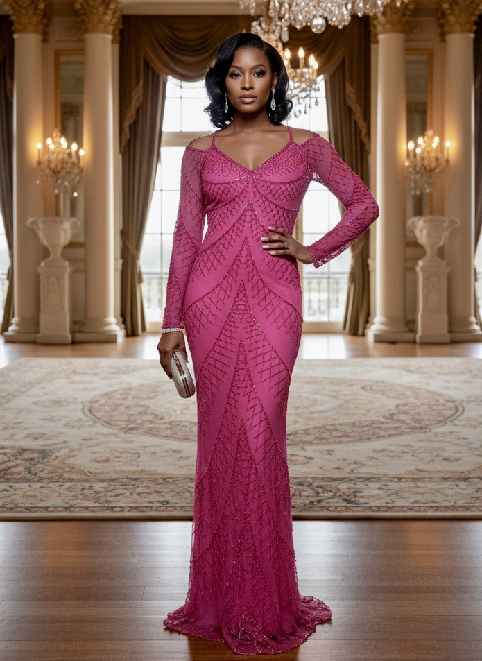 Beautiful long fuchsia gown made on a stretch mesh base for easy fit. Hand beaded. Fuchsia