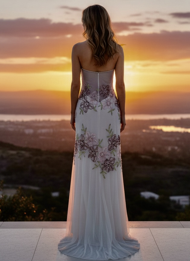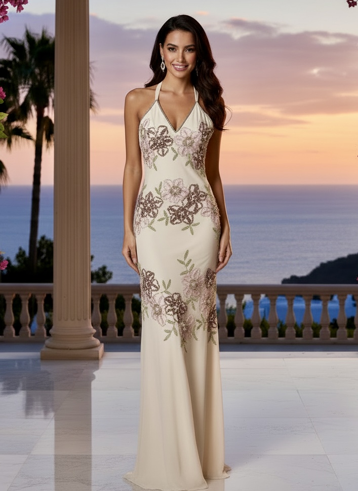 Dress to impress in this stunning floral hand beaded design. Sheer back and beautiful design make this gown an elegant choice for any prom, destination wedding or special event! You will love this dress!! Made on fabulous power mesh for a great fit!