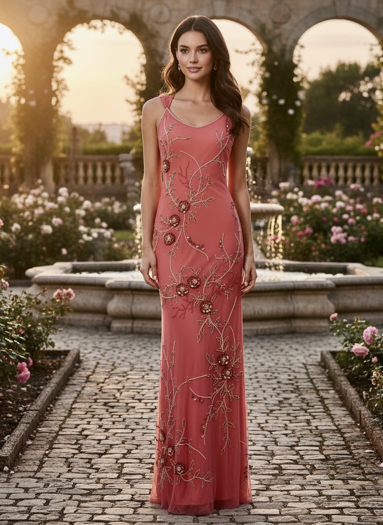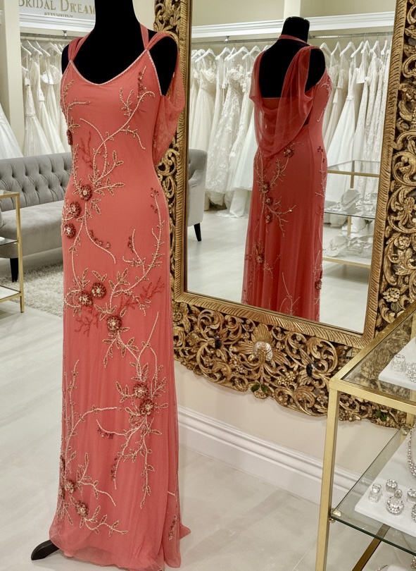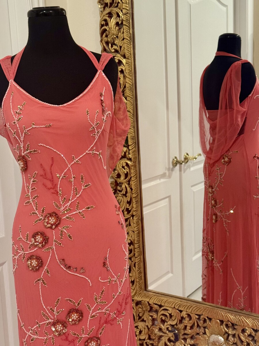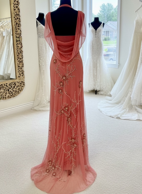 Beautiful long coral gown with intricate beading and pearls. A drape back is elegant and classy. Made out of power mesh stretch fabric for a great fit. One only size extra small.