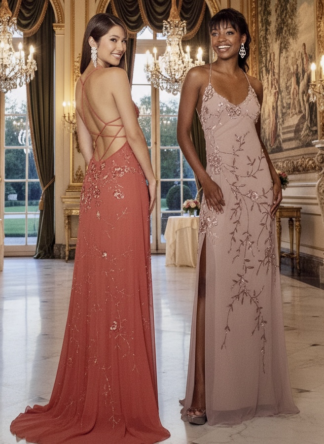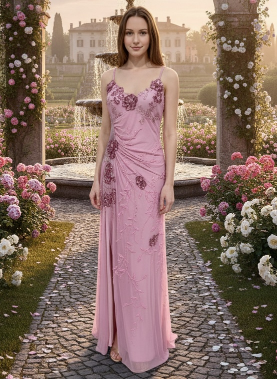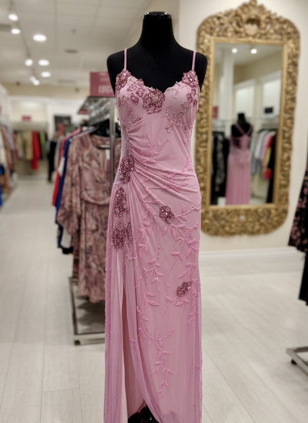 Beautiful cotton candy pink gown with designer back straps. Made on power mesh body, body-conscious fabric for an excellent fit. This dress has a front slit on the right side. very beautiful, low back and train. Size medium.